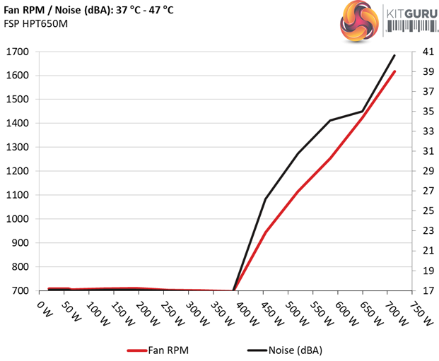 The next chart shows the cooling fan's speed (again, in RPM) and output noise. We measure acoustics from one meter away, inside a hemi-anechoic chamber. Background noise inside the chamber is below 6 dB(A) during testing (it's actually much lower, but our sound meter microphone hits its floor), and the results are obtained with the PSU operating at 37°C (98.6°F) to 47°C (116.6°F)