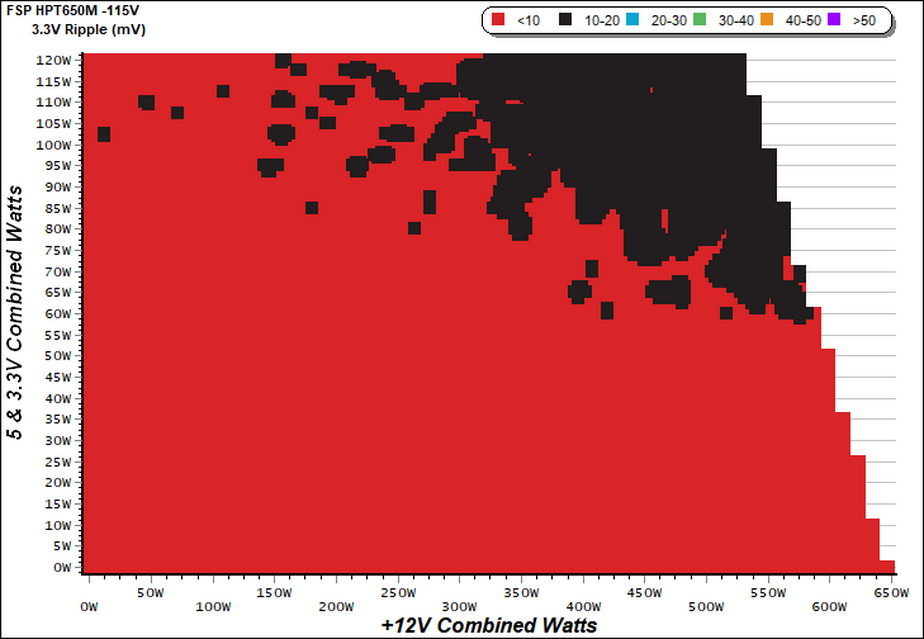 It is good to see a region where efficiency is higher than 92%. From around 110W to 540W at +12V and even with very high loads on the minor rails, the PSU's efficiency stays above 90%.
