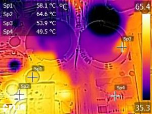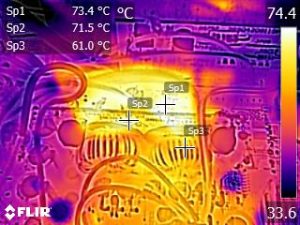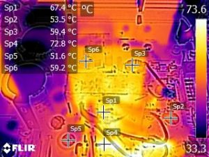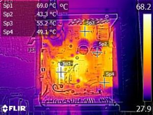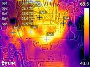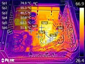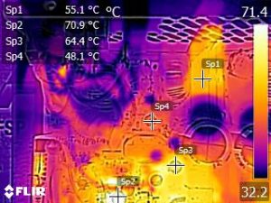 We apply half-load for 10 minutes with the PSU’s top cover and cooling fan removed before taking photos with our modified FLIR E4 camera that delivers 320×240 IR resolution (76,800 pixels).