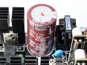 In the APFC converter two Alpha & Omega AOT42S60 FETs are used along with a CREE boost diode. Both bulk caps are provided by Chemi-Con and their combined capacity reaches 780uF, which barely meets the needs of this unit. Apparently MEIC had to use those 390uF caps since the next inline KMR cap has notably larger capacity, at 470uF and there is also the cost difference, since those caps don't come cheap.