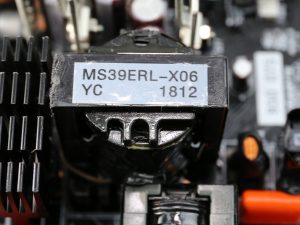 The main transformer of the unit. Right next to it is the resonant tank and the capacitive components of the LLC resonant converters, a couple of X caps. There is also a shield between the transient filter and the resonant tank, providing protection against radiated EMI.
