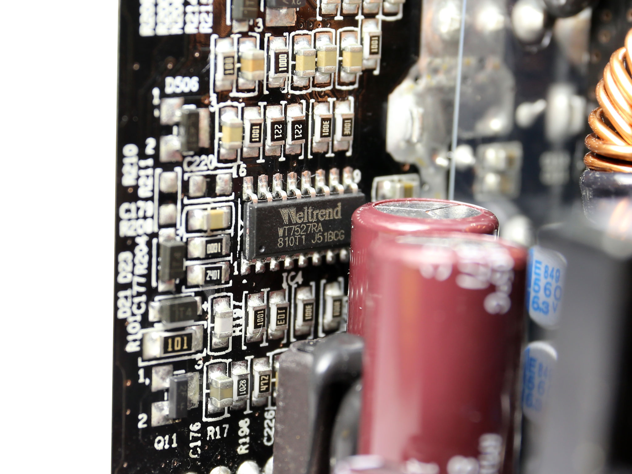 The PSU's protections handles a Weltrend WT7527A IC, located at the back side of the modular board. This IC also has over current protection for up to two +12V rails, besides the minor ones.