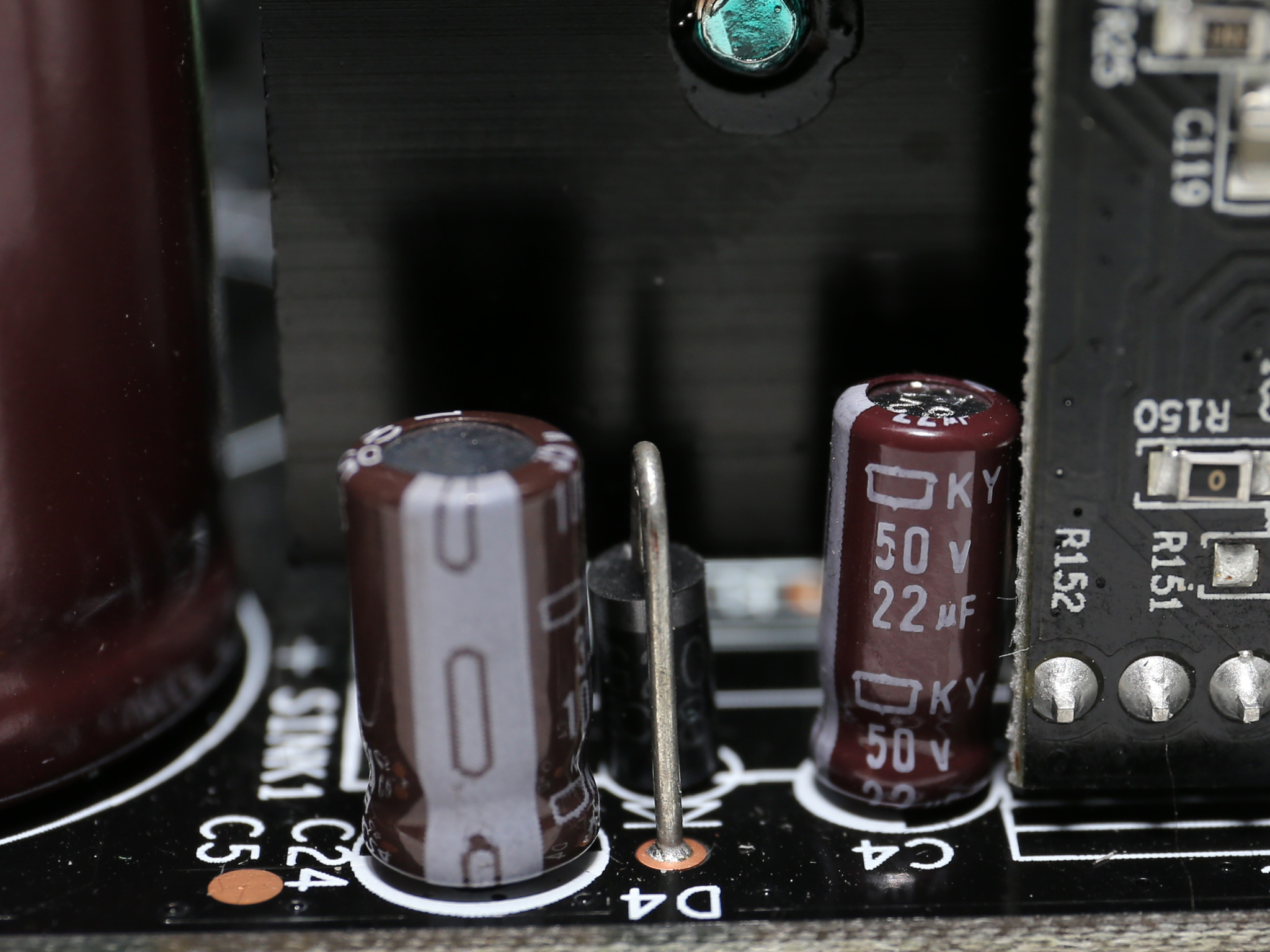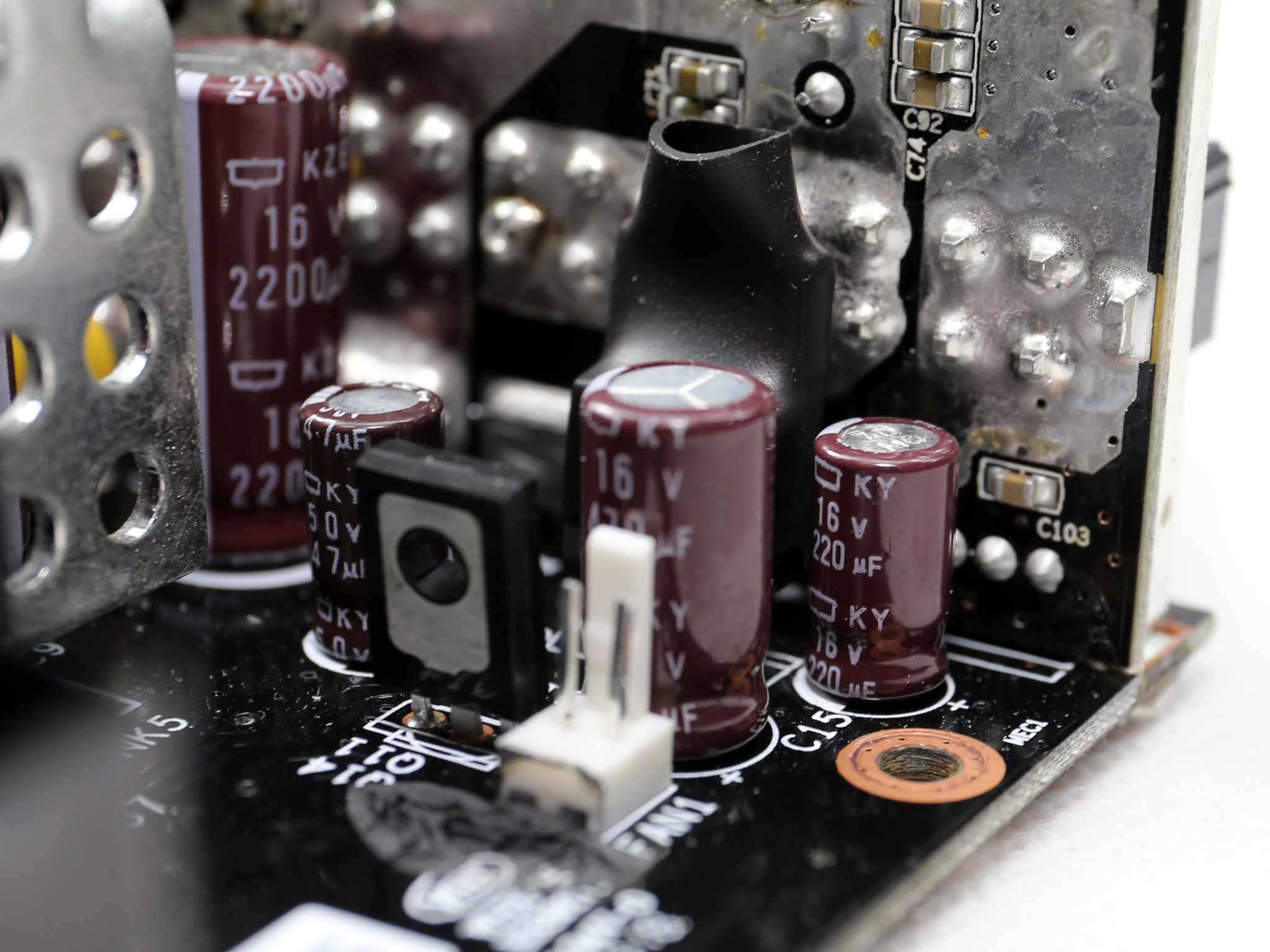 At the front side of the modular PCB, which is connected to the main board through a number of bus bars, a number of polymer Chemi-Con caps provides an extra ripple suppression layer.