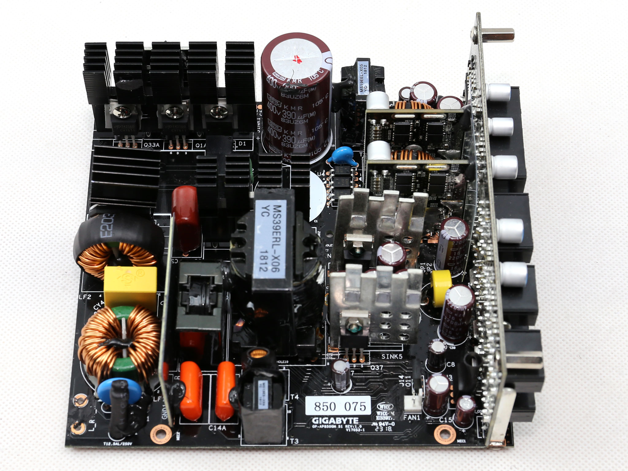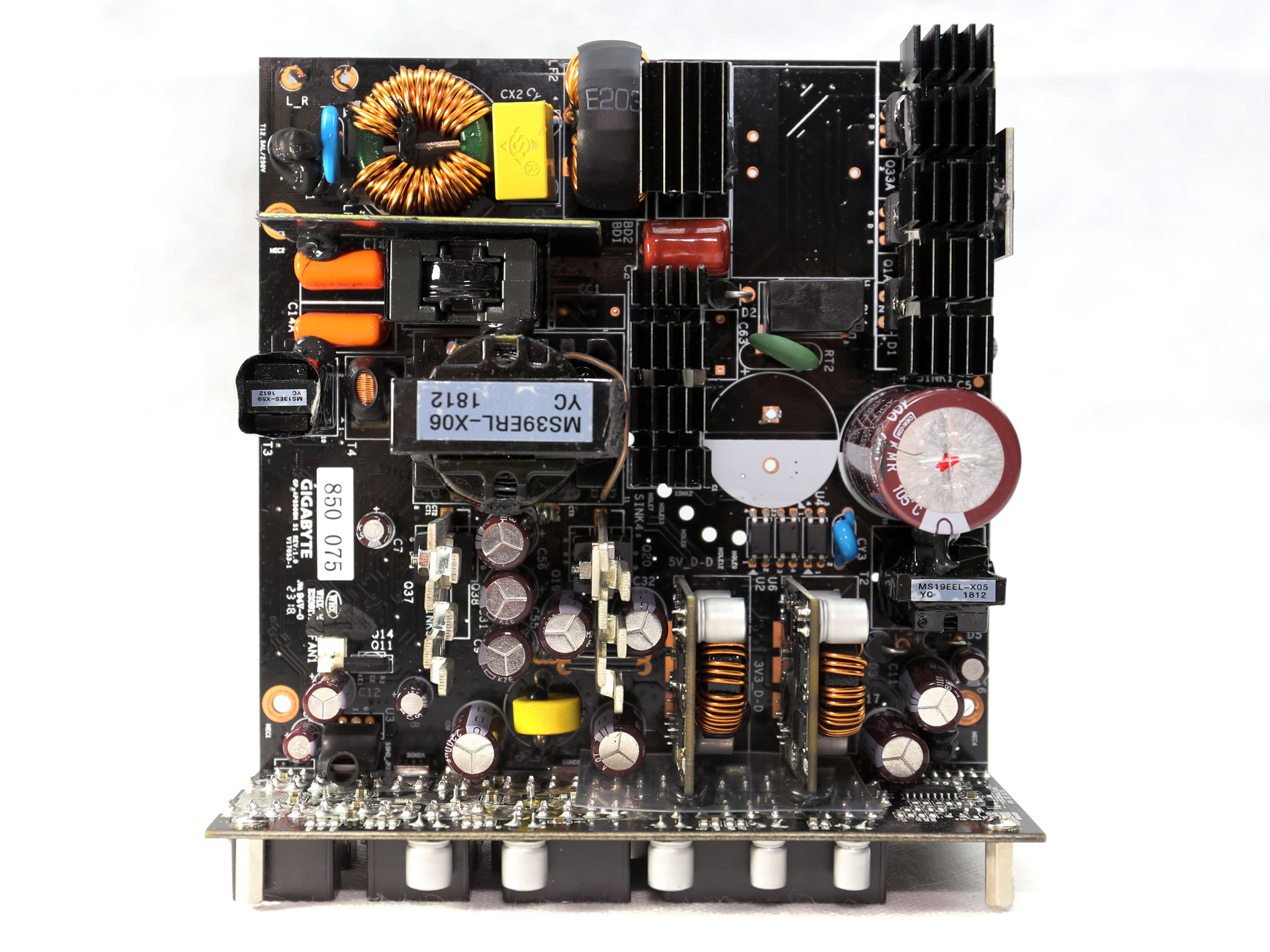 The PFC controller is a Champion CM6500UNX IC, which is supported by a CM03X Green PFC controller that lowers power consumption in standby mode. Both are installed onto a small vertical board.