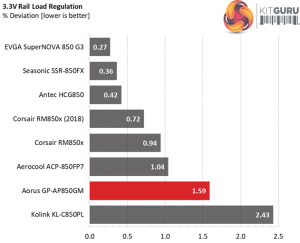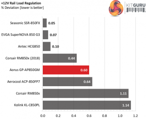 The first set of tests reveals the stability of the voltage rails and the GP-AP850GM’s efficiency. The applied load equals (approximately) 10 to 110 percent of the power supplies maximum load in increments of 10 percentage points.