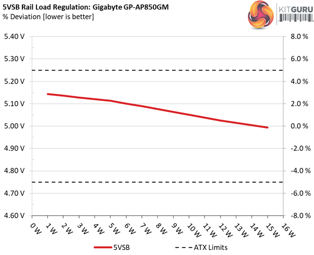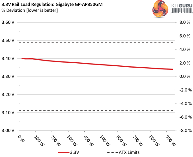 The first set of tests reveals the stability of the voltage rails and the GP-AP850GM’s efficiency. The applied load equals (approximately) 10 to 110 percent of the power supplies maximum load in increments of 10 percentage points.
