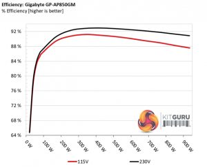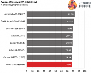 The Aorus unit naturally takes the lead from the Gold competition, however it stays behind two Platinum models with similar capacity. With light loads its efficiency is not high.