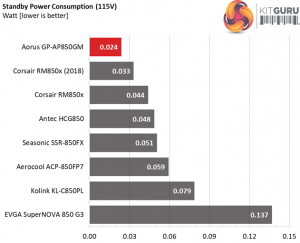 In the table below, you’ll find the power consumption and voltage values of all rails (except -12V) when the PSU is idle (powered on, but without any load on its rails), and the power consumption when the unit is in standby mode (without any load, at 5VSB).