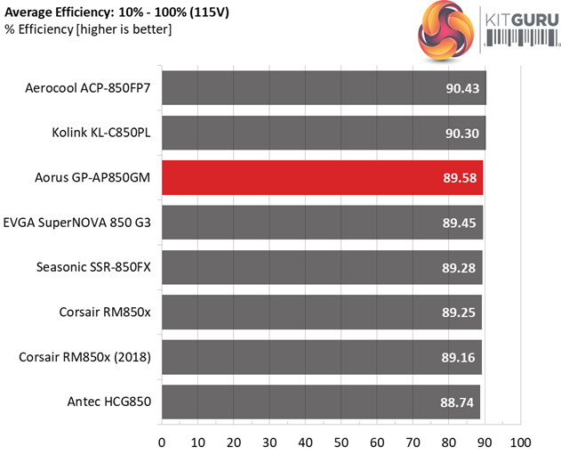 The Aorus unit naturally takes the lead from the Gold competition, however it stays behind two Platinum models with similar capacity. With light loads its efficiency is not high.