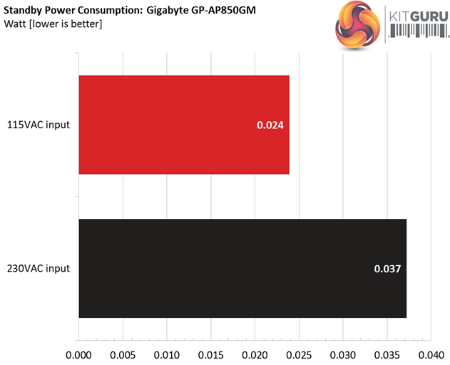 In the table below, you’ll find the power consumption and voltage values of all rails (except -12V) when the PSU is idle (powered on, but without any load on its rails), and the power consumption when the unit is in standby mode (without any load, at 5VSB).