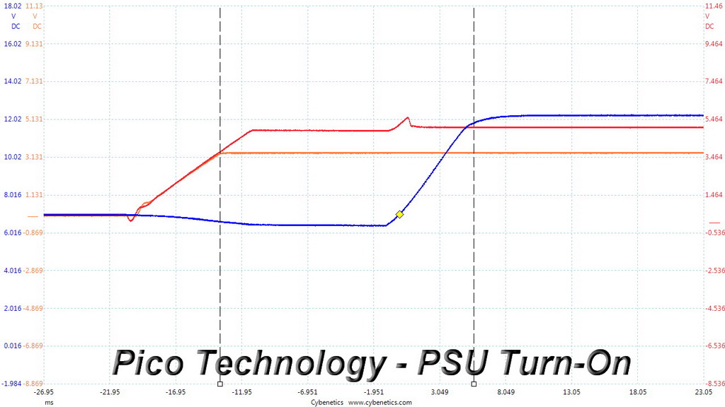 According to Intel’s most recent Power Supply Design Guide (revision 1.4) the +12V and 5V voltages must be equal or greater than the 3.3V rail’s output at all times, during the power-up and normal operation. For our first measurement, we turn the unit off and switch it back on without any load in any of the rails.