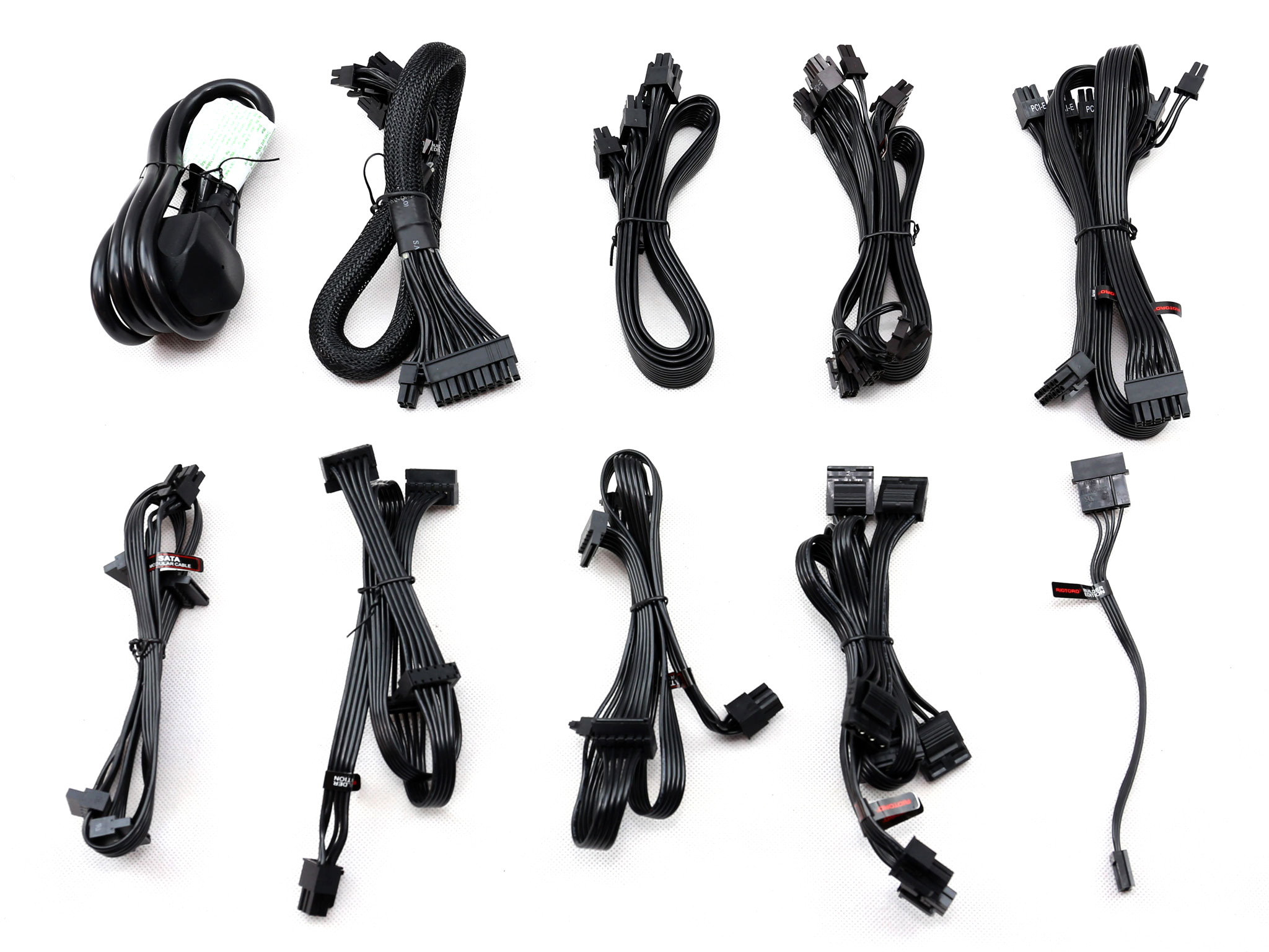 A large number of cables and connectors are provided, including two EPS and eight PCIe connectors along with twelve SATA cables. There are also six 4-pin Molex connectors spread across two cables.