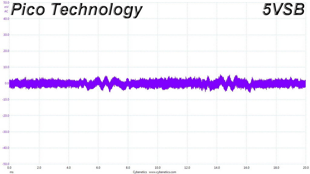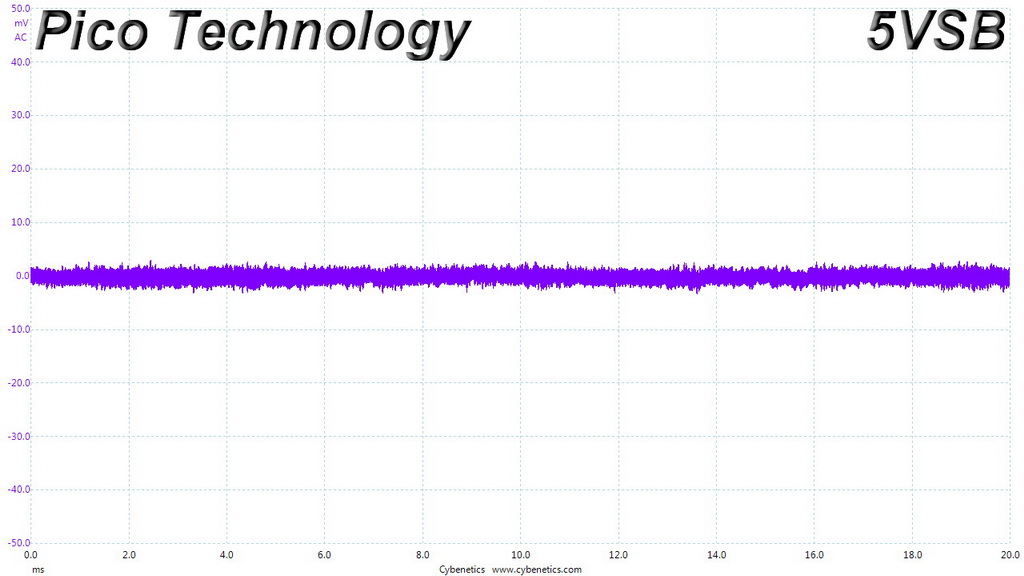 The following oscilloscope screenshots illustrate the AC ripple and noise registered on the main rails (+12V, 5V, 3.3V and 5VSB). The bigger the fluctuations on the screen, the bigger the ripple/noise. We set 0.01 V/Div (each vertical division/box equals 0.01V) as the standard for all measurements.