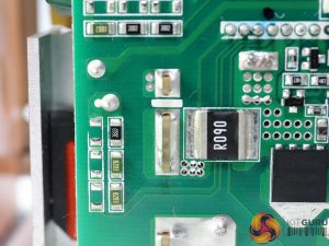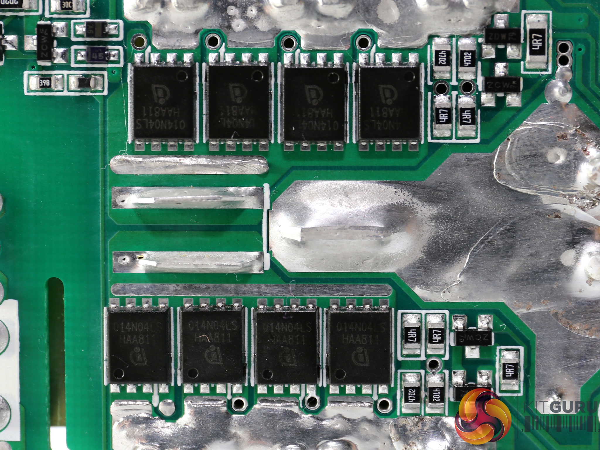 In the secondary side eight Infineon BSC014N04LS handle the +12V rail. Those FETs are installed on the solder side of the main PCB.