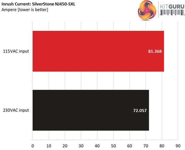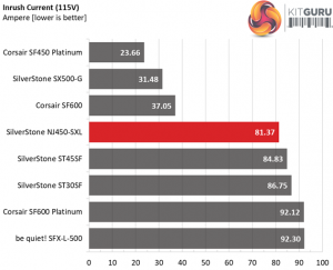 The first set of tests reveals the stability of the voltage rails and the NJ450-SXL’s efficiency. The applied load equals (approximately) 10 to 110 percent of the power supplies maximum load in increments of 10 percentage points.