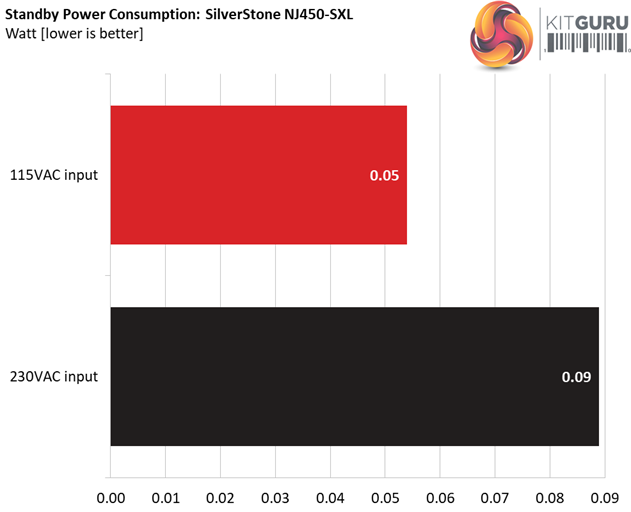 In the table below, you'll find the power consumption and voltage values of all rails (except -12V) when the PSU is idle (powered on, but without any load on its rails), and the power consumption when the unit is in standby mode (without any load, at 5VSB).