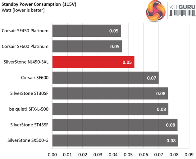 In the following tests, we measure the NJ450-SXL's efficiency at loads significantly lower than 10 percent of its maximum capacity (the lowest load the 80 PLUS standard measures). The loads we dial are 20, 40, 60, and 80W. This is important for representing when a PC is idle, with power-saving features turned on.