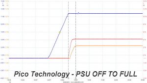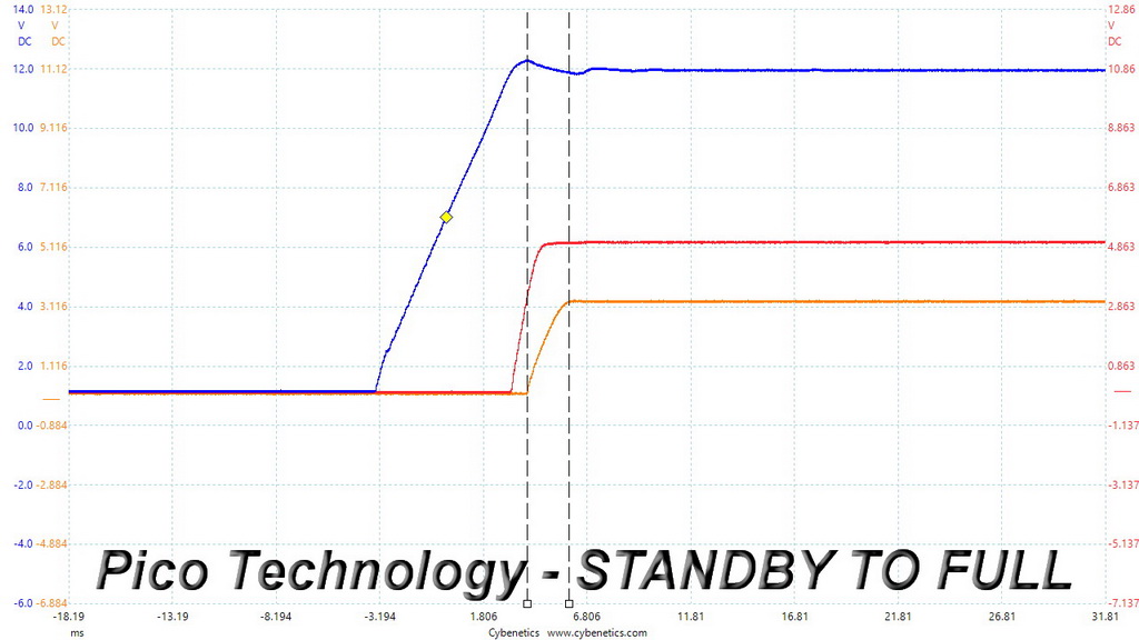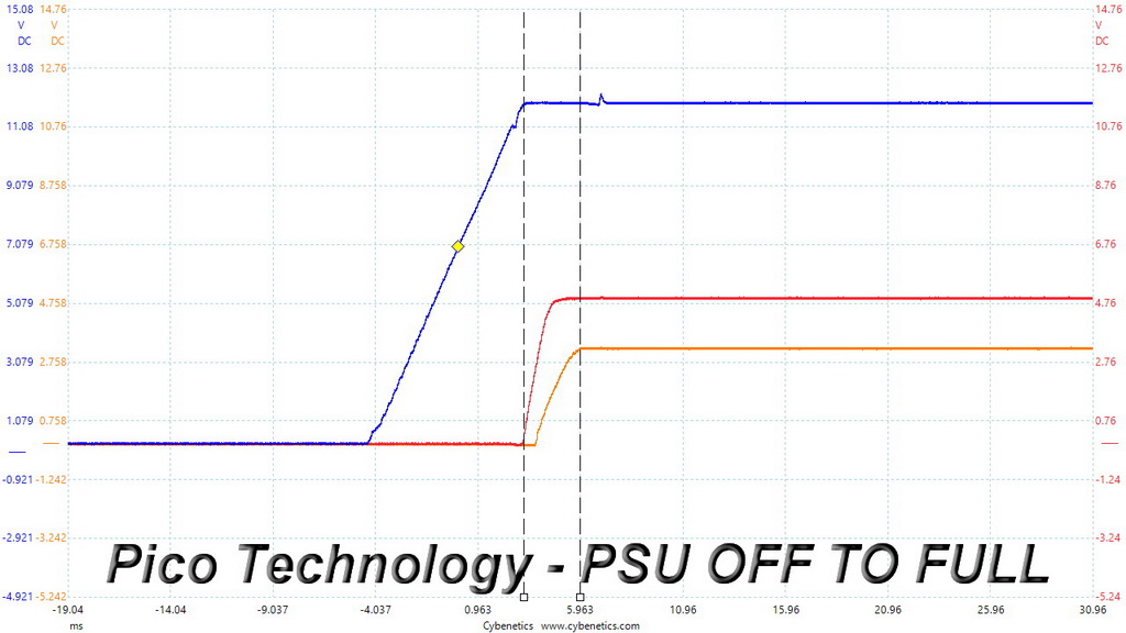 According to Intel’s most recent Power Supply Design Guide (revision 1.4) the +12V and 5V voltages must be equal or greater than the 3.3V rail’s output at all times, during the power-up and normal operation. For our first measurement, we turn the unit off and switch it back on without any load in any of the rails.