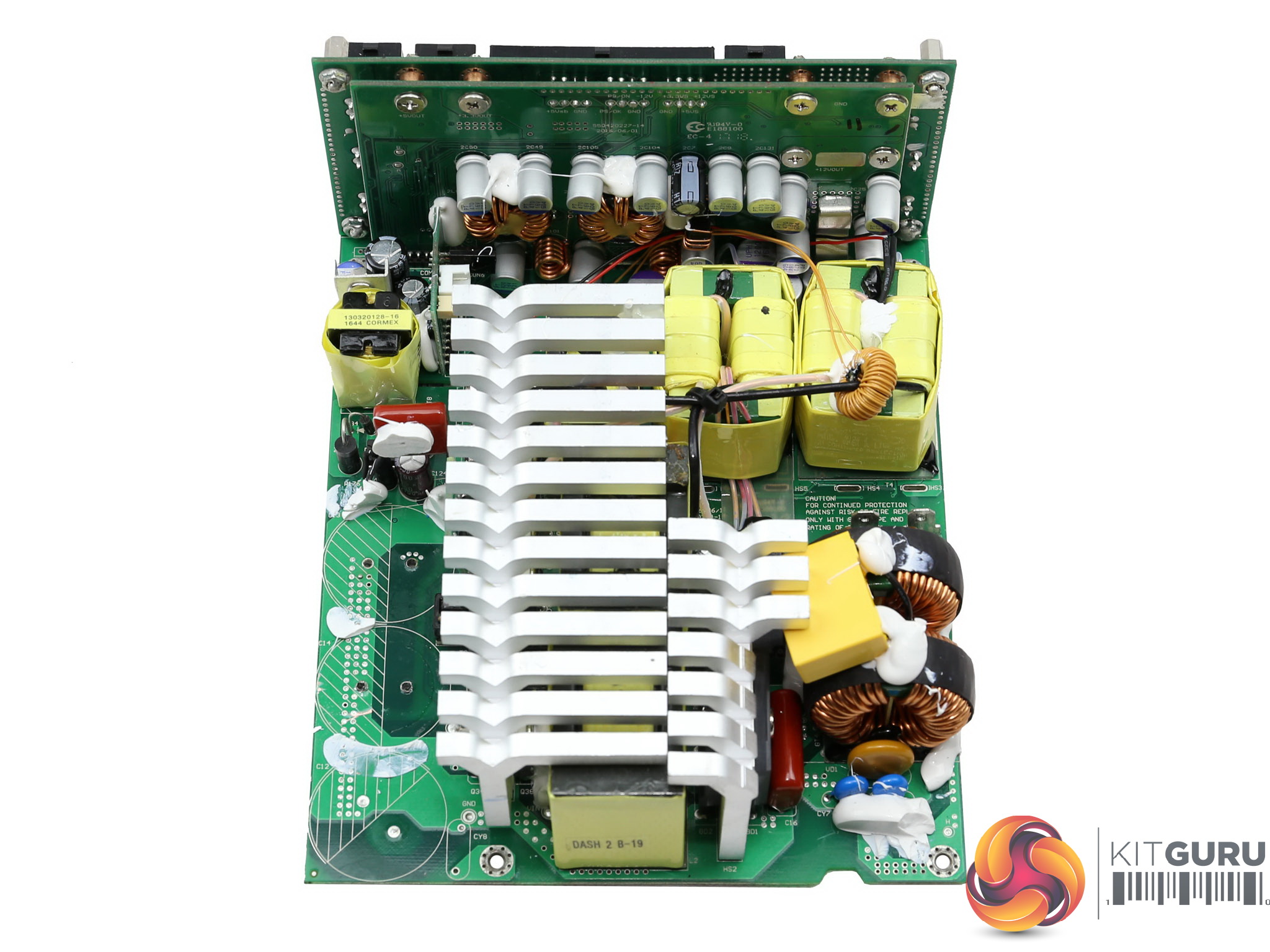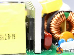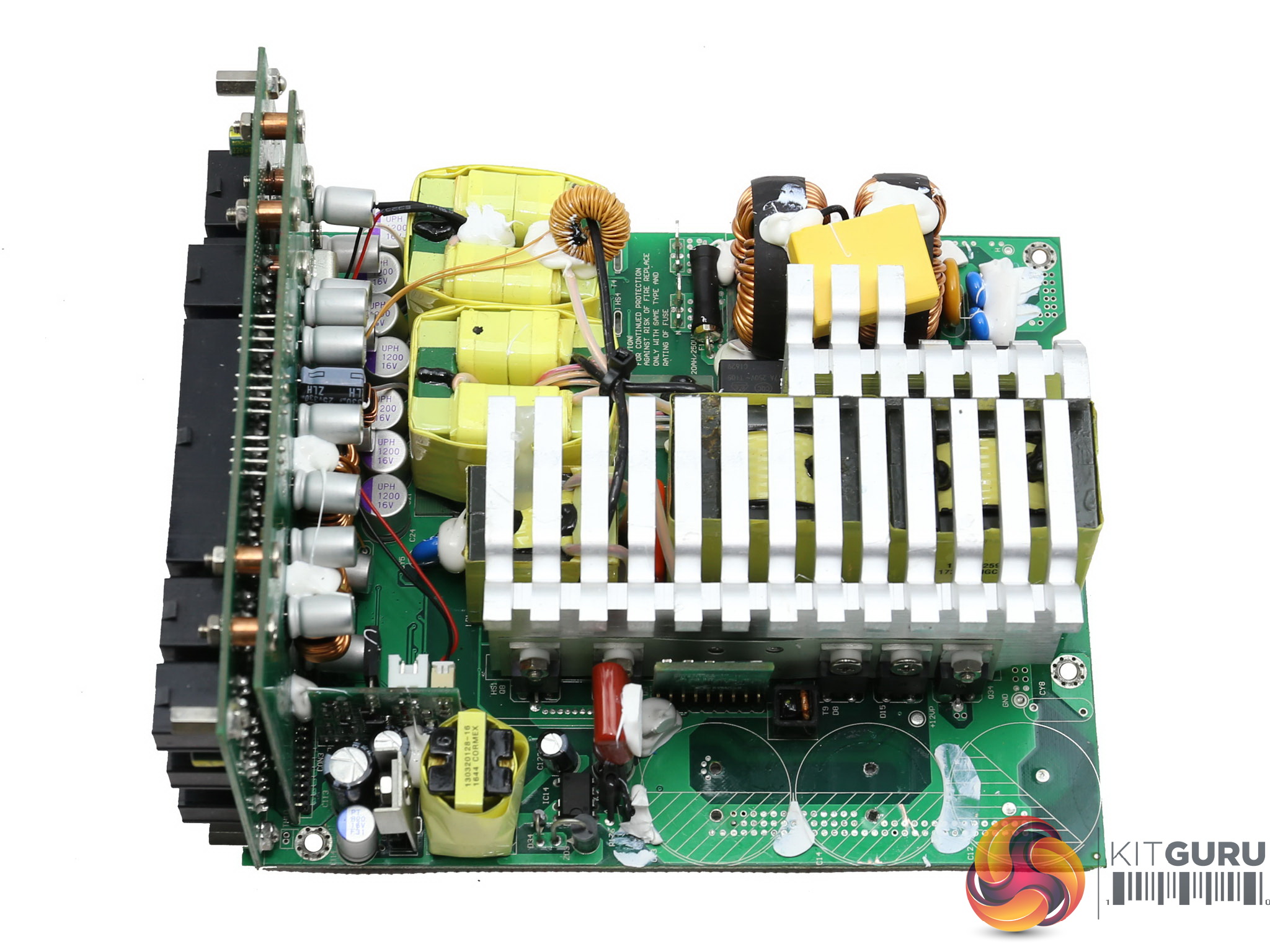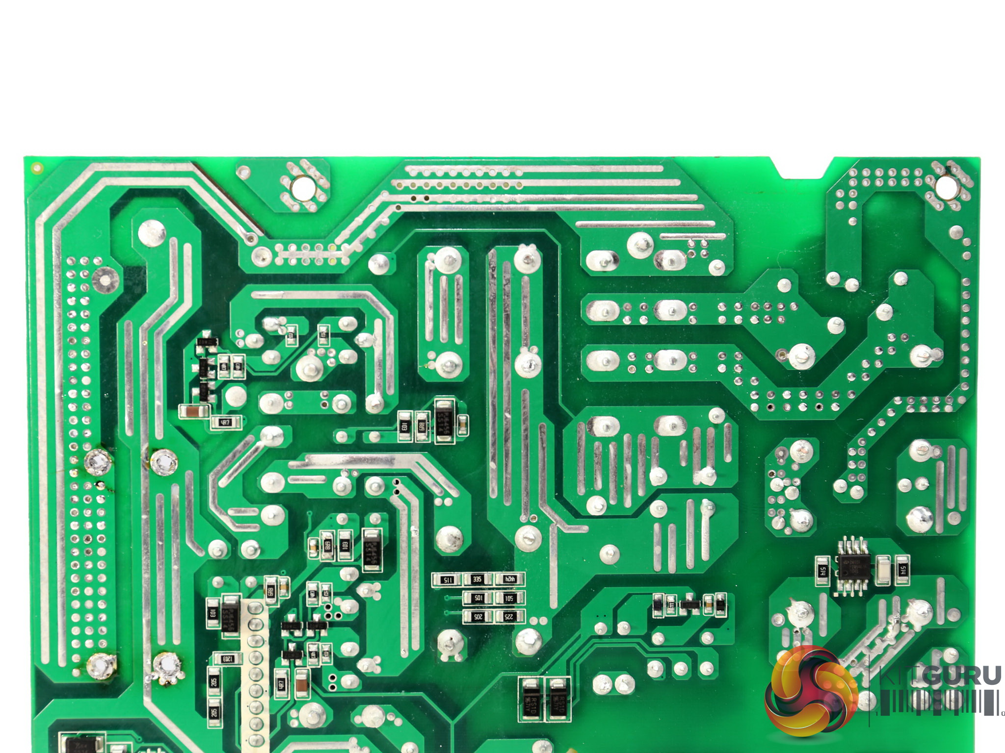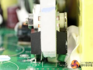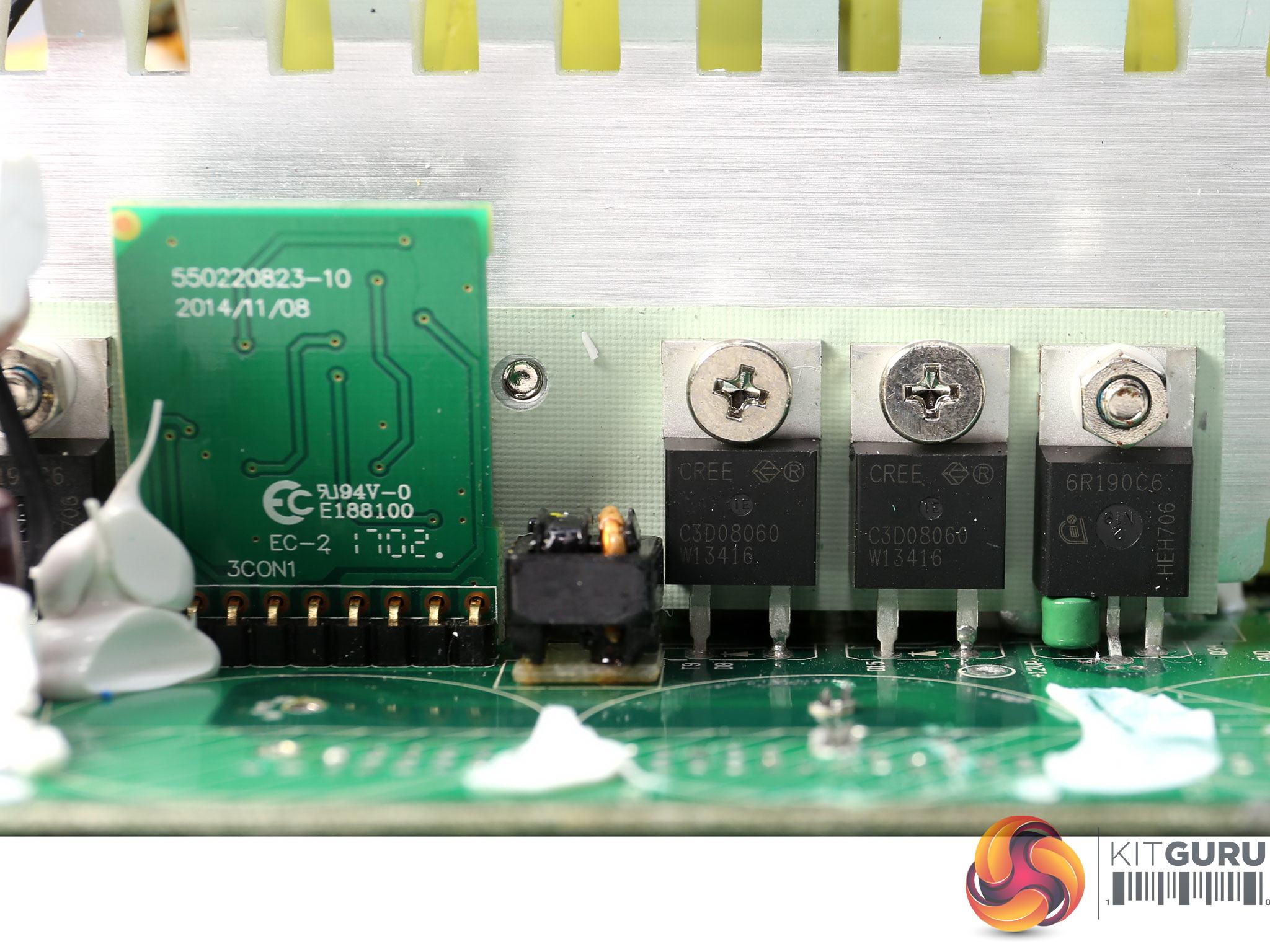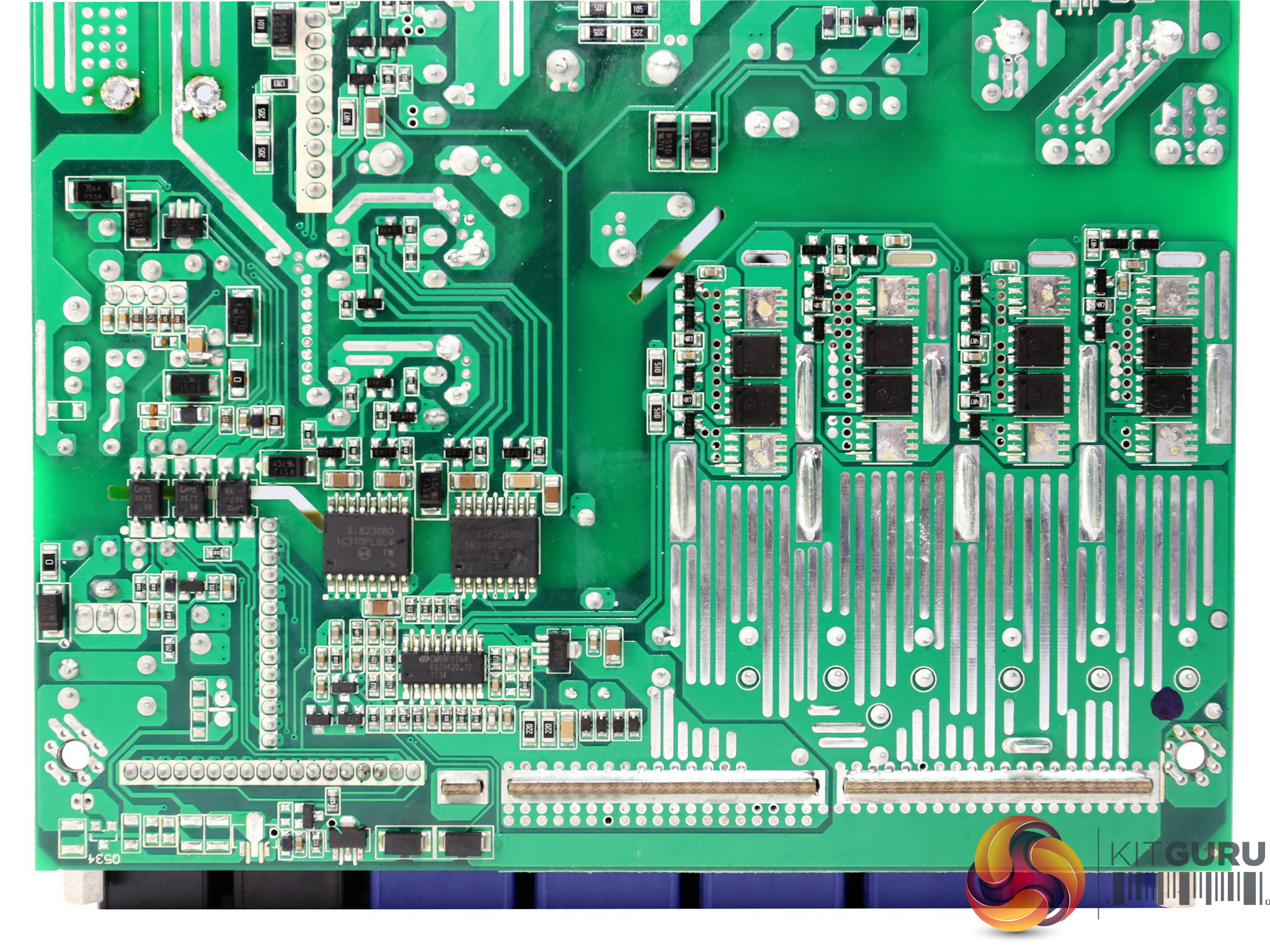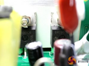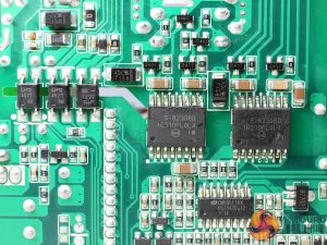 In the secondary side, eight Infineon BSC014N04LS FETs regulate the +12V rail. Those FETs are installed on the solder side of the PCB and are mostly cooled by the chassis, with a thermal pad providing the contact between the two. As you can see in the photo above, there is room for eight more FETs, space which is utilised in the 1500W Strider Titanium model.