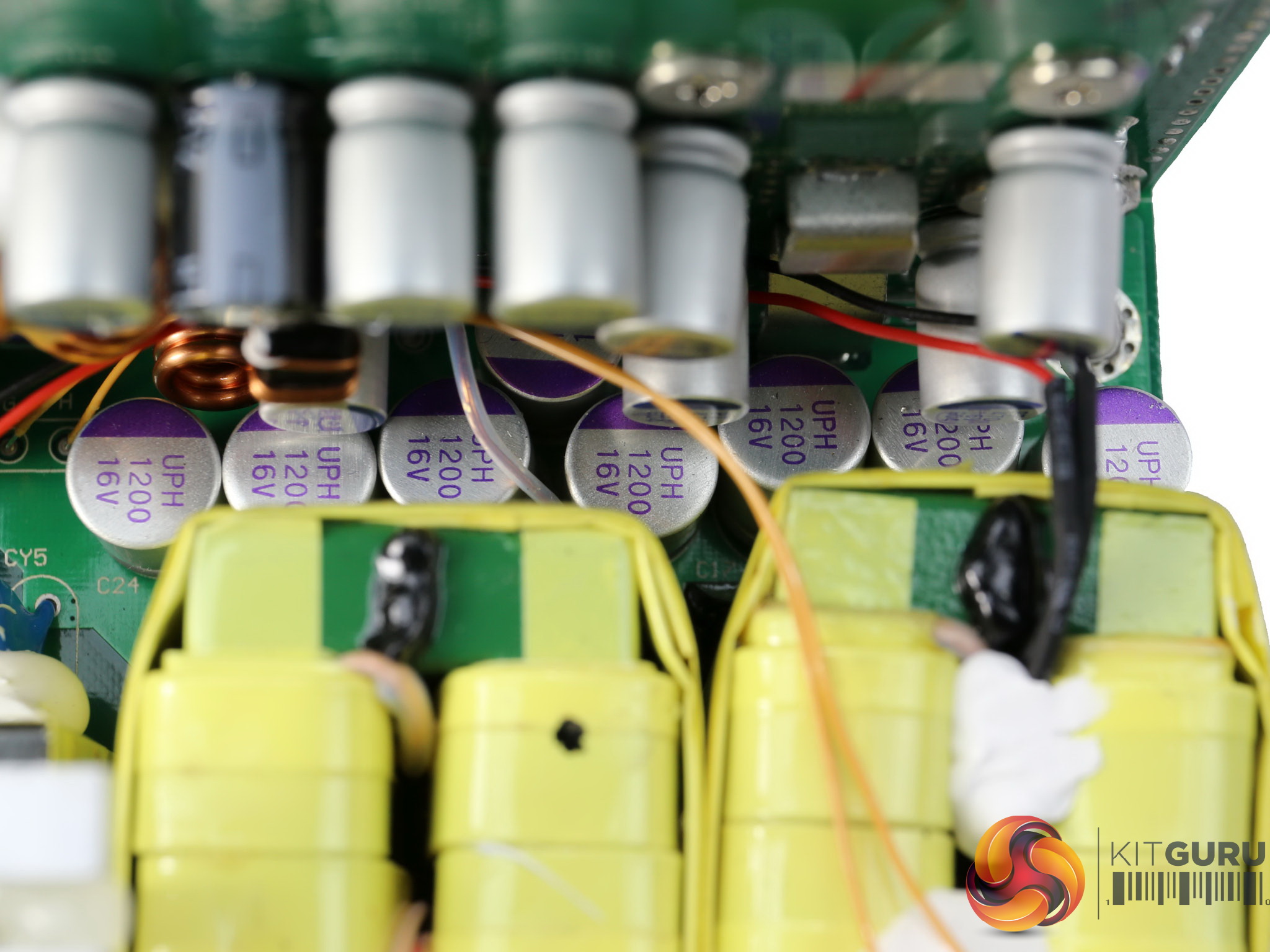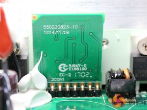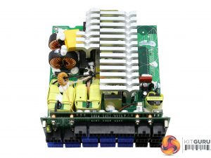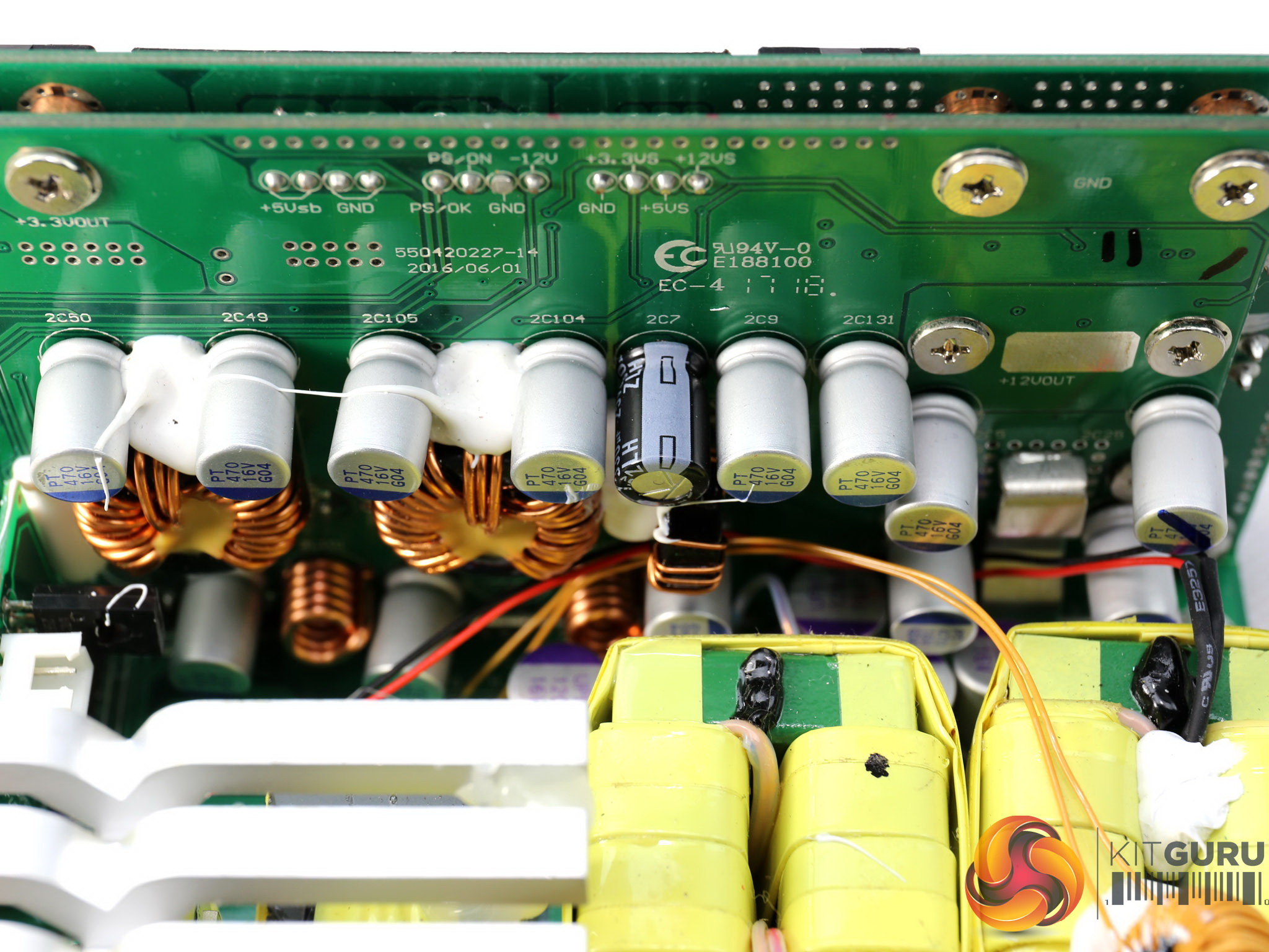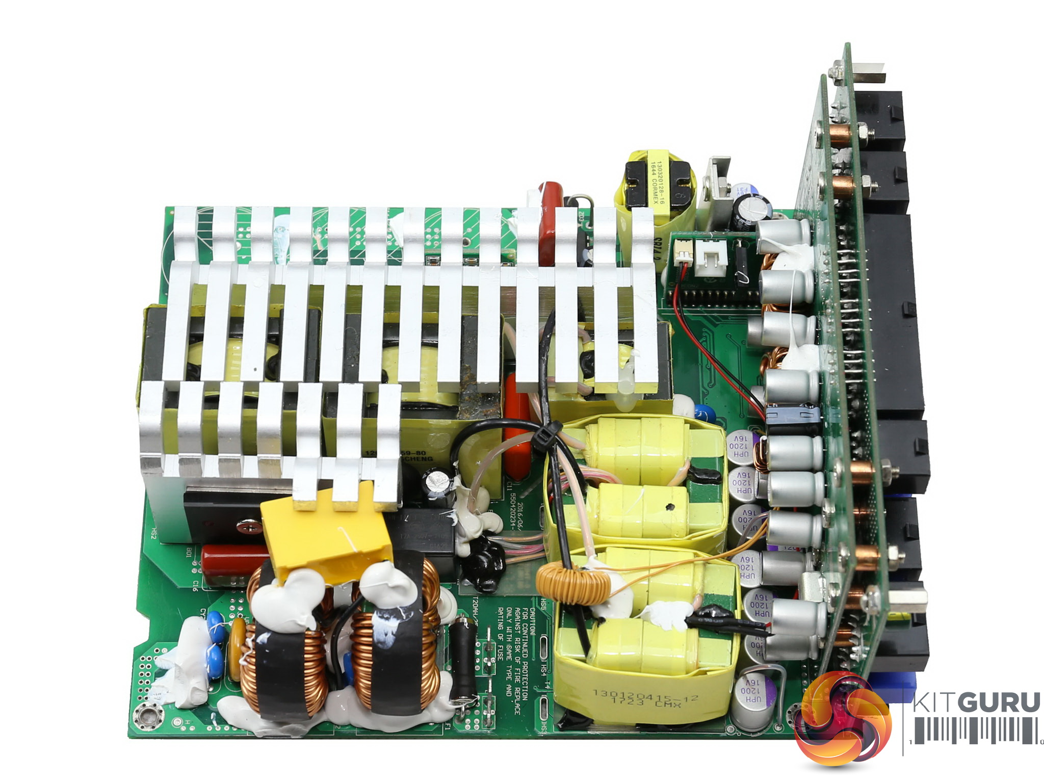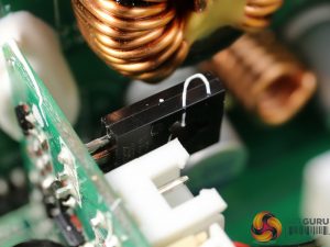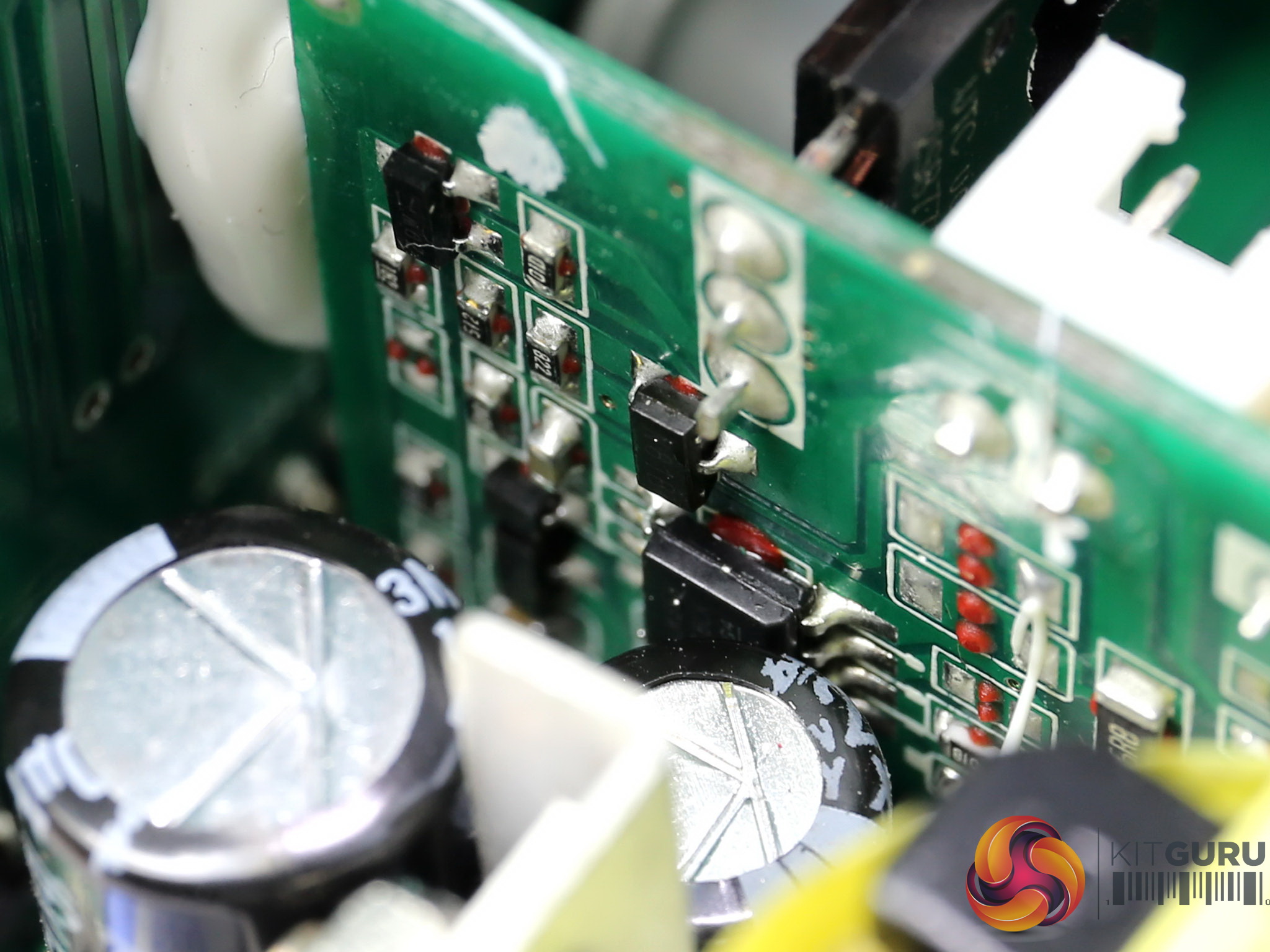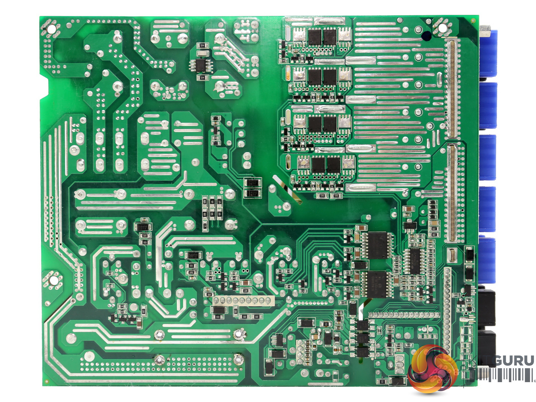 In the secondary side, eight Infineon BSC014N04LS FETs regulate the +12V rail. Those FETs are installed on the solder side of the PCB and are mostly cooled by the chassis, with a thermal pad providing the contact between the two. As you can see in the photo above, there is room for eight more FETs, space which is utilised in the 1500W Strider Titanium model.