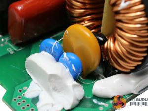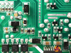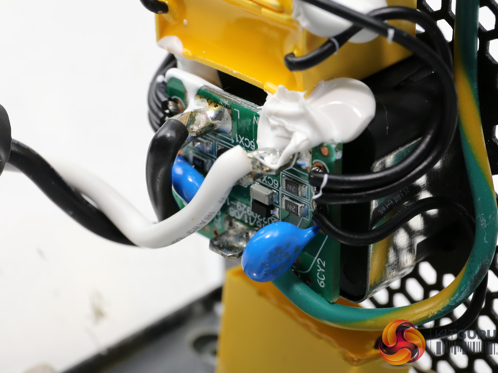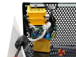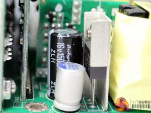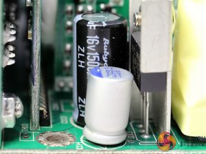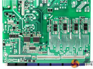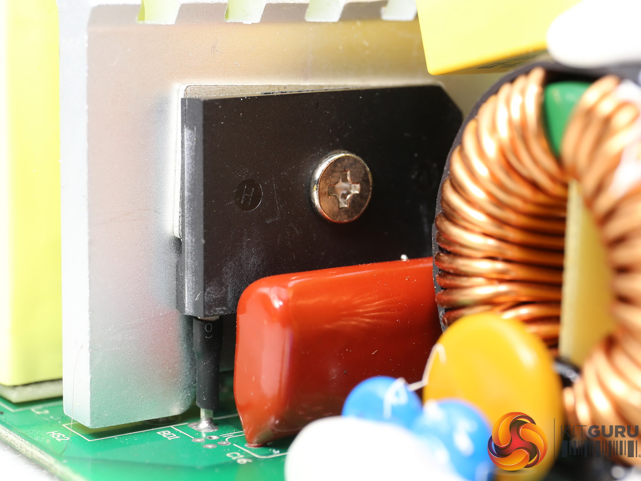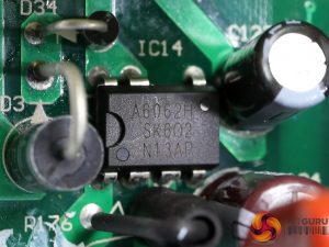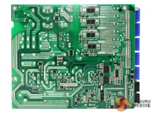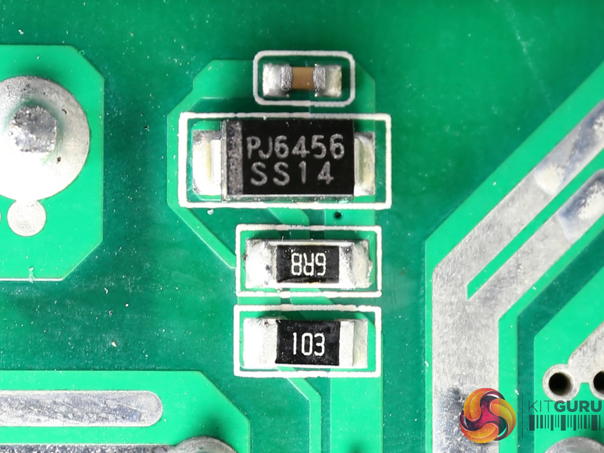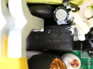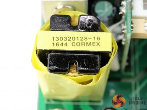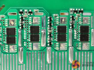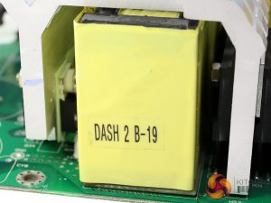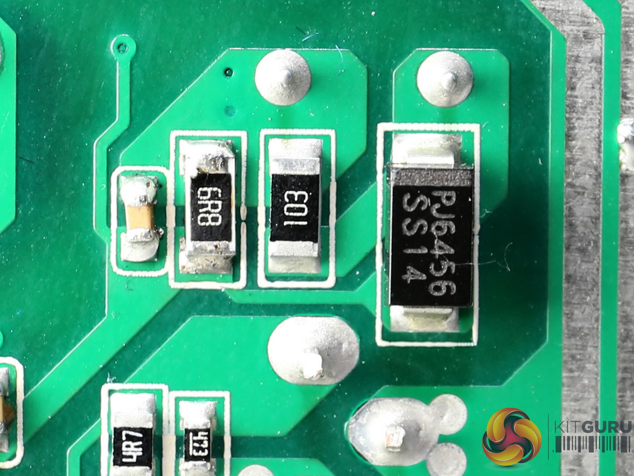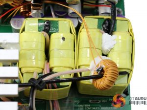 In the secondary side, eight Infineon BSC014N04LS FETs regulate the +12V rail. Those FETs are installed on the solder side of the PCB and are mostly cooled by the chassis, with a thermal pad providing the contact between the two. As you can see in the photo above, there is room for eight more FETs, space which is utilised in the 1500W Strider Titanium model.
