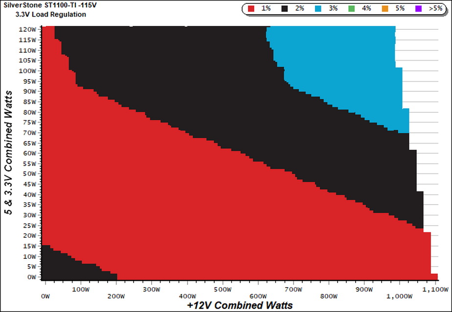 To generate the following charts, we set our loaders to auto mode through our custom-made software before trying more than 1500 possible load combinations with the +12V, 5V, and 3.3V rails. The load regulation deviations in each of the charts below are calculated by taking the nominal values of the rails (12V, 5V, and 3.3V) as point zero. The ambient temperature is between at 30°C (86°F) to 32°C (89.6°F).