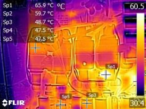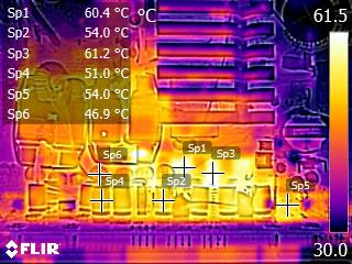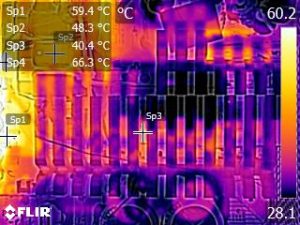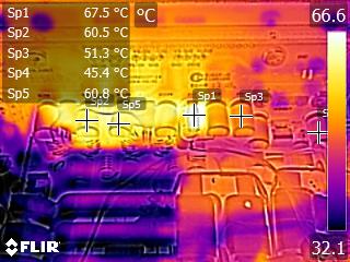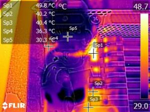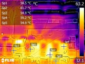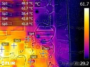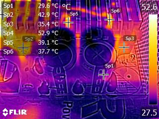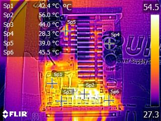 We apply half-load for 10 minutes with the PSU’s top cover and cooling fan removed before taking photos with our modified FLIR E4 camera that delivers 320×240 IR resolution (76,800 pixels).