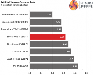 The transient response of the +12V rail is good and in line with the tough competition. The 5V and 5VSB rails perform quite well, however the 3.3V rail doesn't follow and it drops its voltage very low in all of our tests, and it even fails in one of them.