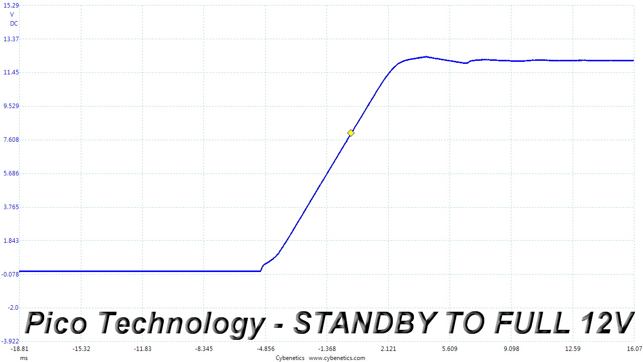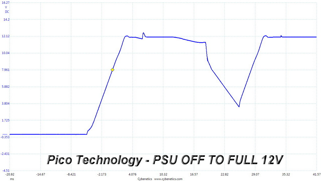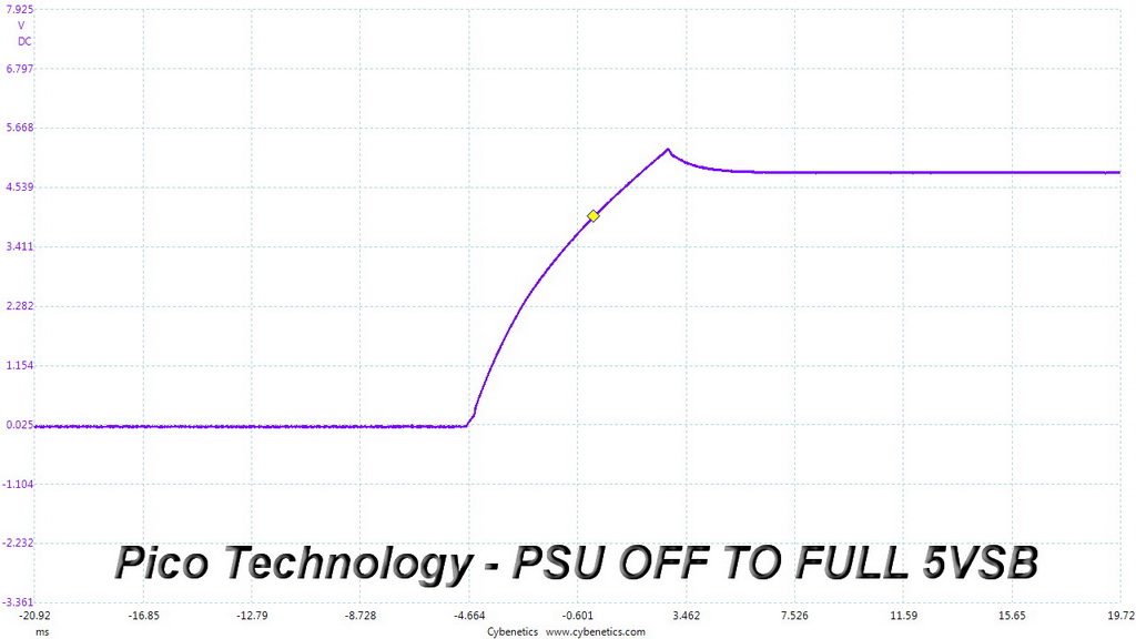 In the second test, we dial the maximum load the +12V rail can handle and start the PSU while it is in standby mode