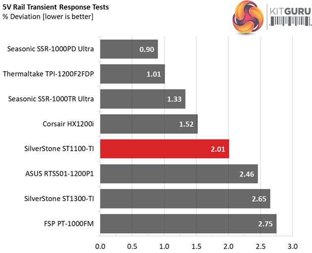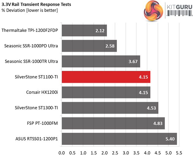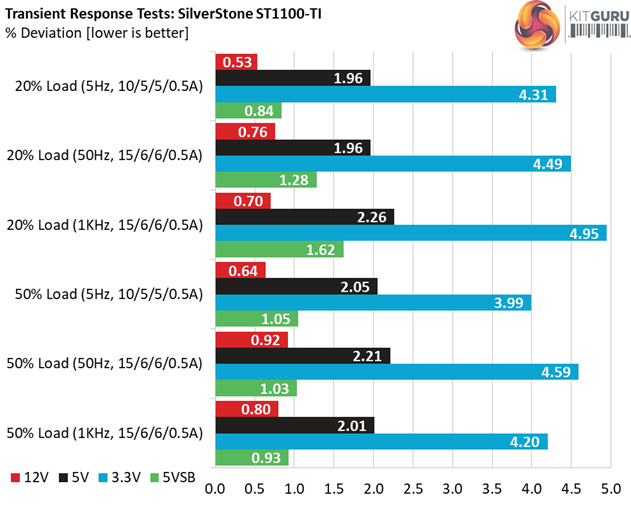The transient response of the +12V rail is good and in line with the tough competition. The 5V and 5VSB rails perform quite well, however the 3.3V rail doesn't follow and it drops its voltage very low in all of our tests, and it even fails in one of them.