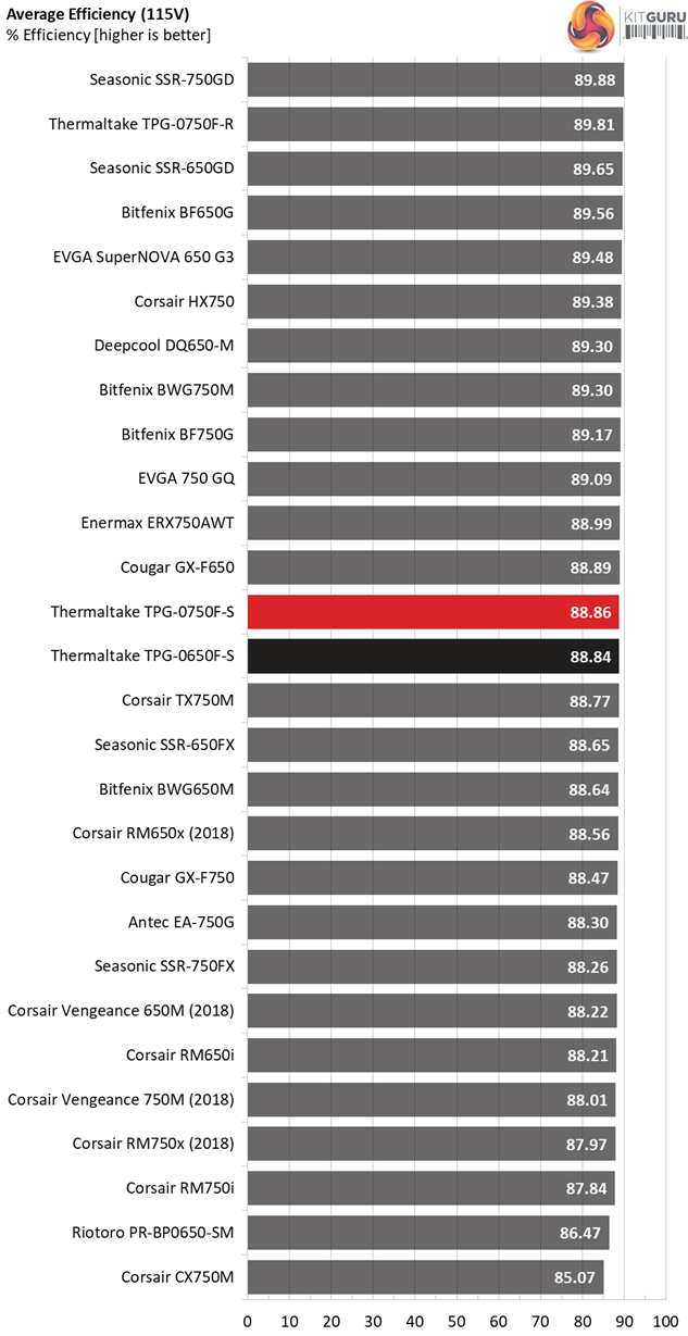 The following graph shows the TPG-750AH3FSGR’s total performance rating, comparing it to other units we have tested. To be more specific, the tested unit is shown as 100 percent, and every other unit's performance is shown relative to it.
