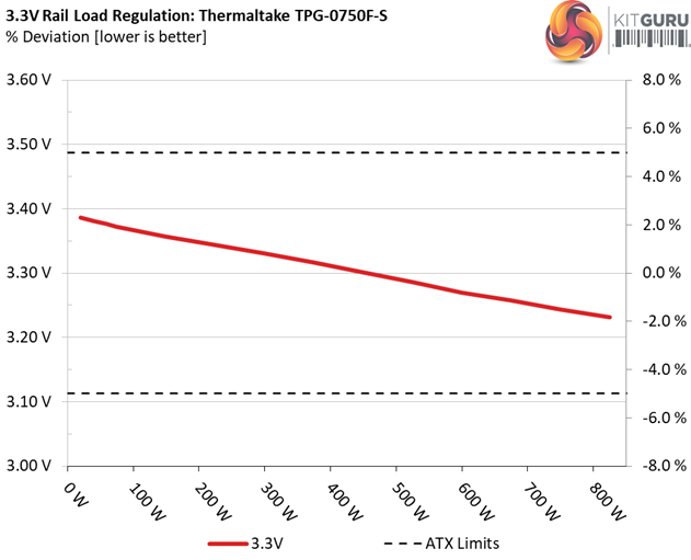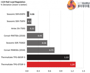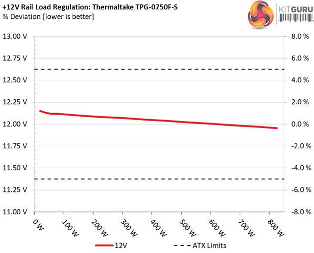 The first set of tests reveals the stability of the voltage rails and the TPG-750AH3FSGR’s efficiency. The applied load equals (approximately) 10 to 110 percent of the power supplies maximum load in increments of 10 percentage points.