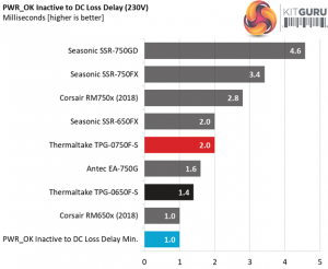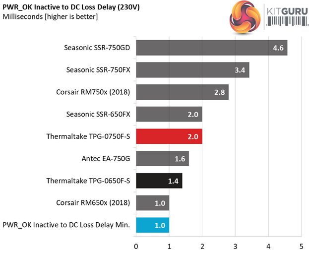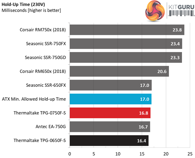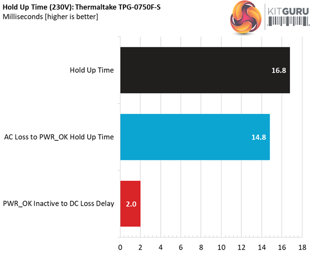 The hold-up is very close to 17ms, with the power ok signal needing 1.2ms to reach 16ms, which is what the ATX spec requires. At least it is accurate (the power ok signal).