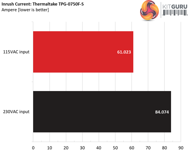 We measure high inrush current with both voltage inputs. What make us wonder here is the sky high inrush reading of the 650W model.