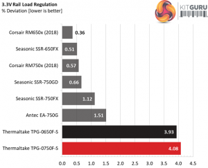 The load regulation at +12V is a bit loose, at 1.29%. The minor rails fall behind as well, compared to the competition, with the 5V, 3.3V and 5VSB rails registering 2.41%, 4.08% and 5.01% deviations, respectively. Obviously High Power didn't pay much attention in load regulation and this will surely affect the overall performance.