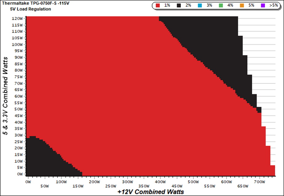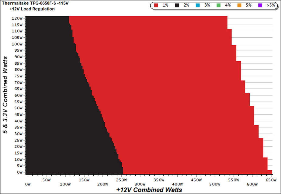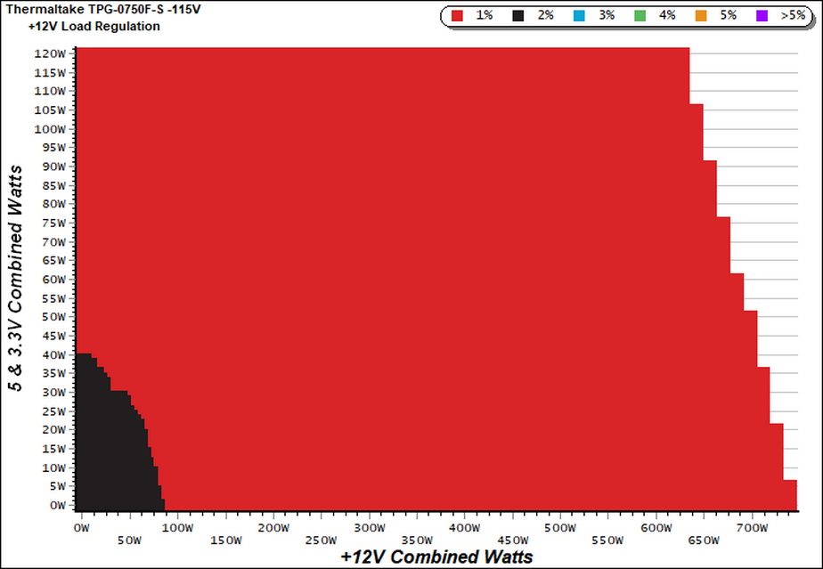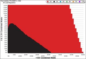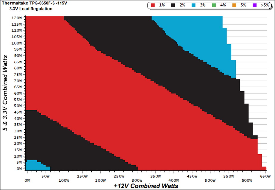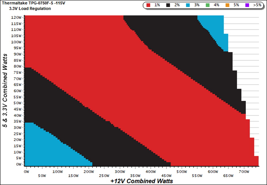 To generate the following charts, we set our loaders to auto mode through our custom-made software before trying more than 1500 possible load combinations with the +12V, 5V, and 3.3V rails. The load regulation deviations in each of the charts below are calculated by taking the nominal values of the rails (12V, 5V, and 3.3V) as point zero. The ambient temperature is between at 30°C (86°F) to 32°C (89.6°F).