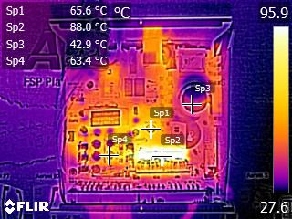 We apply half-load for 10 minutes with the PSU’s top cover and cooling fan removed before taking photos with our modified FLIR E4 camera that delivers 320×240 IR resolution (76,800 pixels).