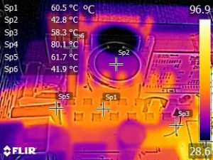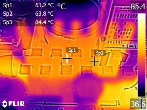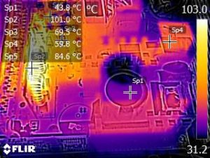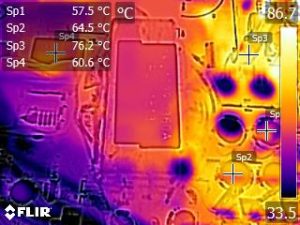 The temperature of the bulk cap stays low, however the VRMs get quite hot since we apply more than 10 Amps load in each of the minor rails. The temperatures of the polymer caps on the VRMs' daughter-board are increased as well, but this type of caps are tolerant to high temperatures.