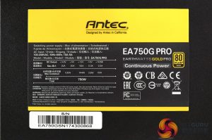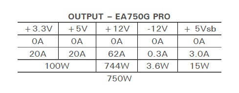 The EA750G Pro can deliver 62A on the +12V rail for a total of 744 watts output. Both +3.3V and +5V rails deliver 20A for a total of 100 watts.