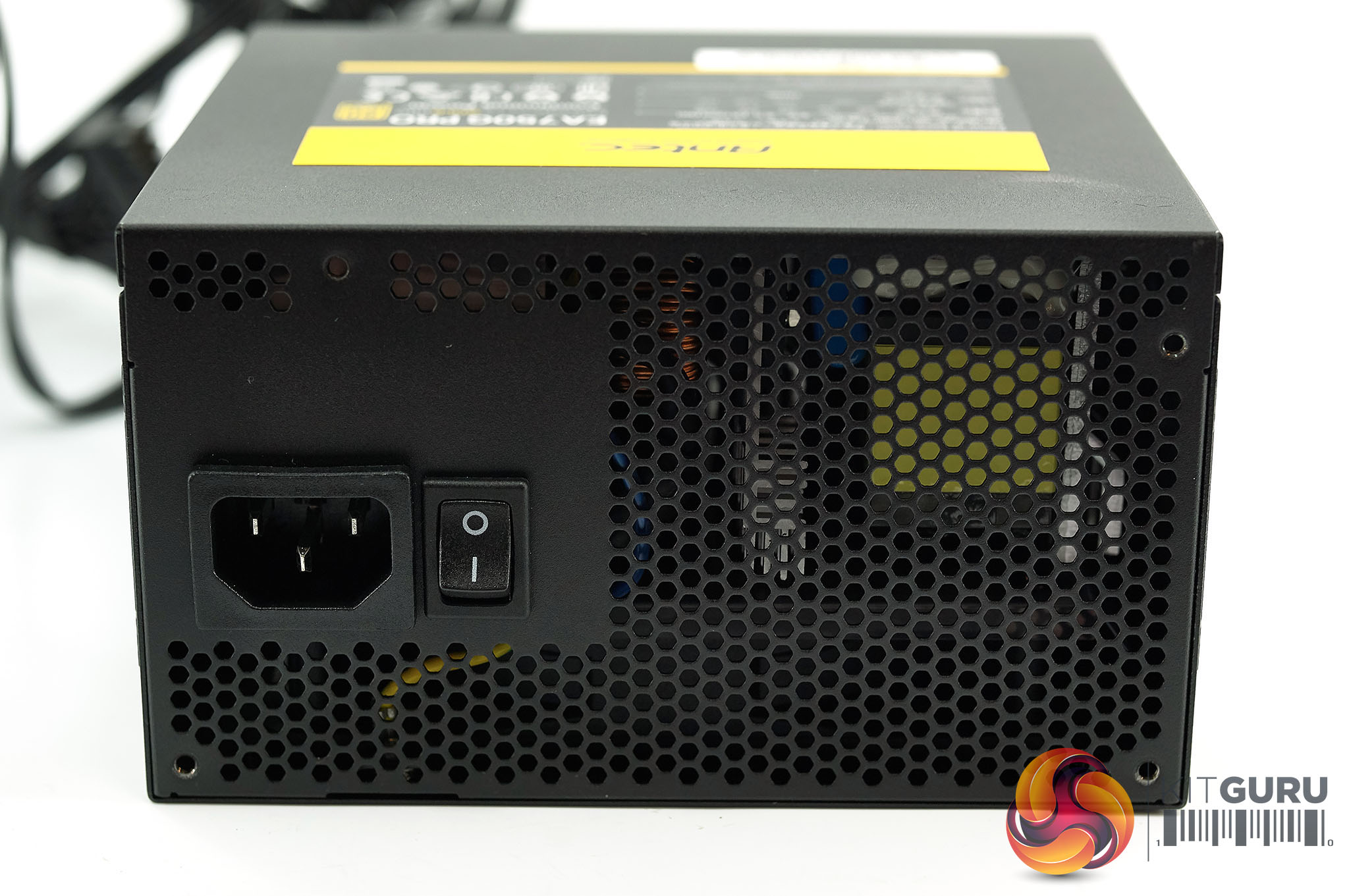 One side of the power supply is vented to aid air flow, with a power connection and switch offset to the side.