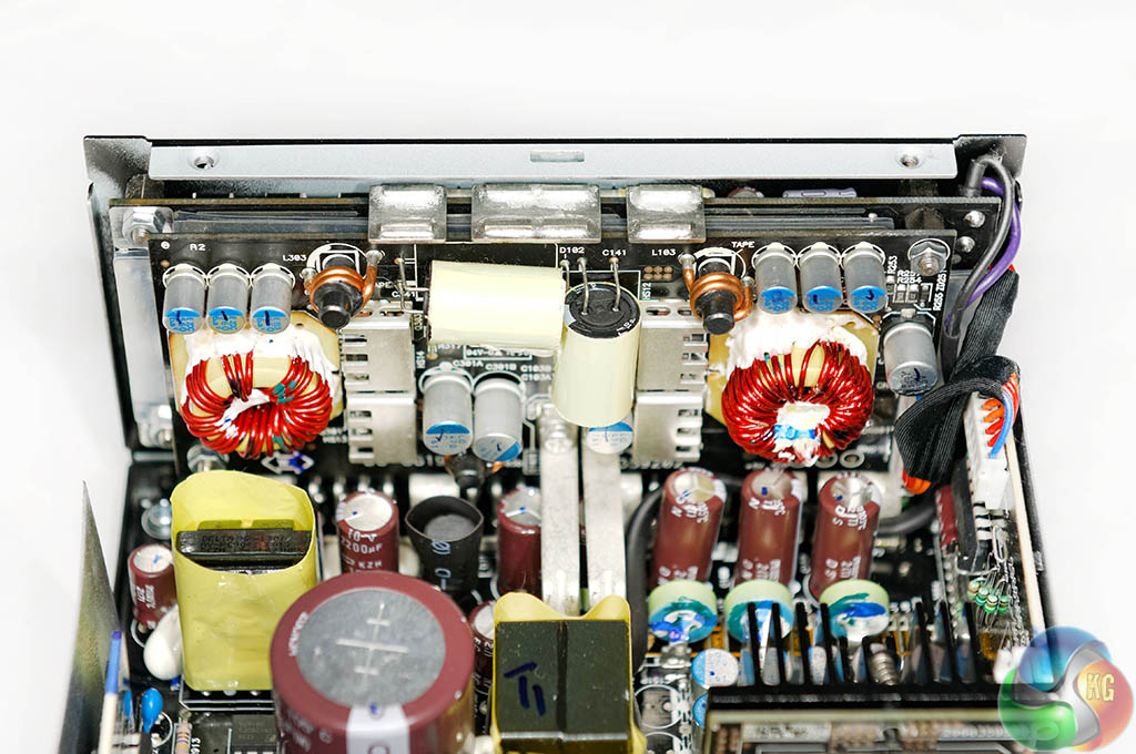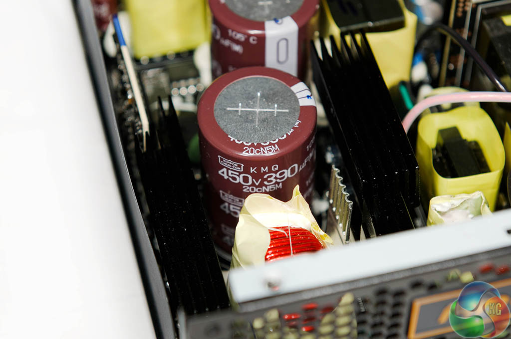 The 1350W model in this series used higher capacity Rubycon capacitors in the primary stage. The HCP 850 is using quality 105c Nippon Chemi Con capacitors, rated 450V, 390μF each.