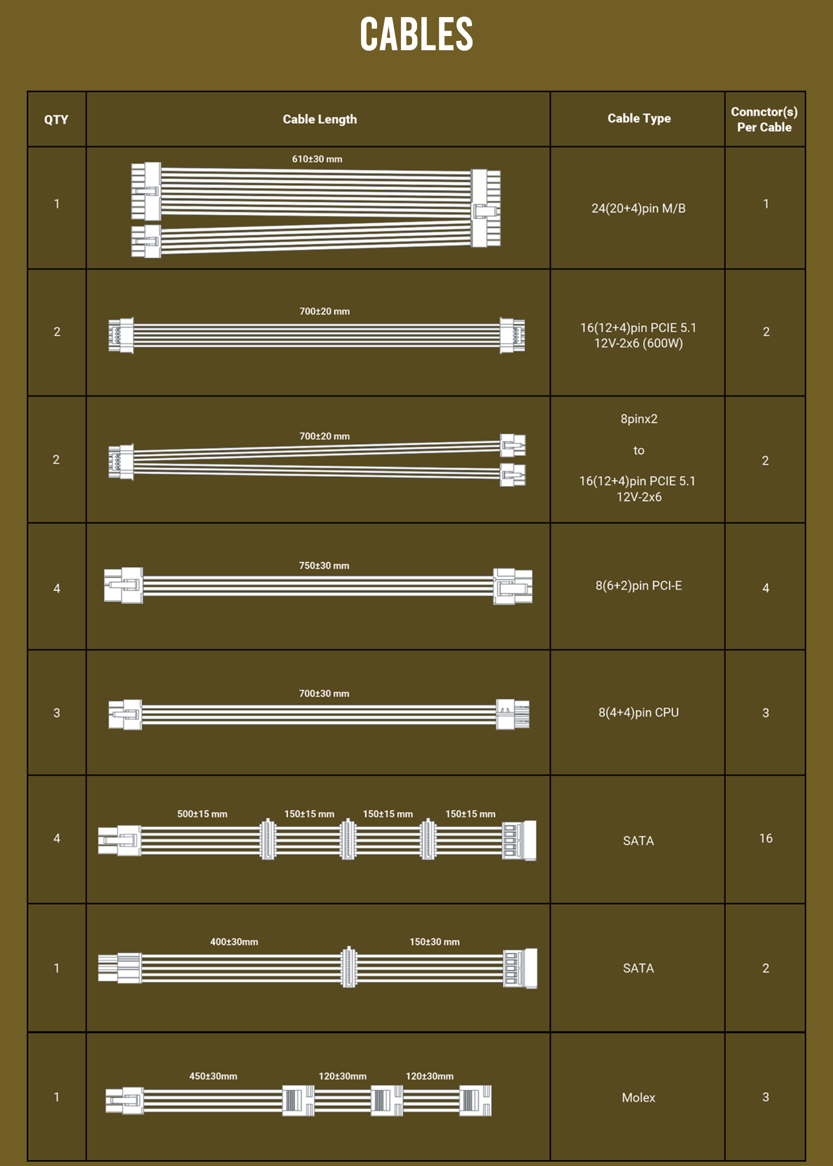 The cables are all high quality and individually sleeved, offering reassuring quality for a power supply at this hefty asking price. Cables are all between 16-18AWG. The 12+4 Pin PCIe (600w) cables are 16-24AWG, and there are two of them.