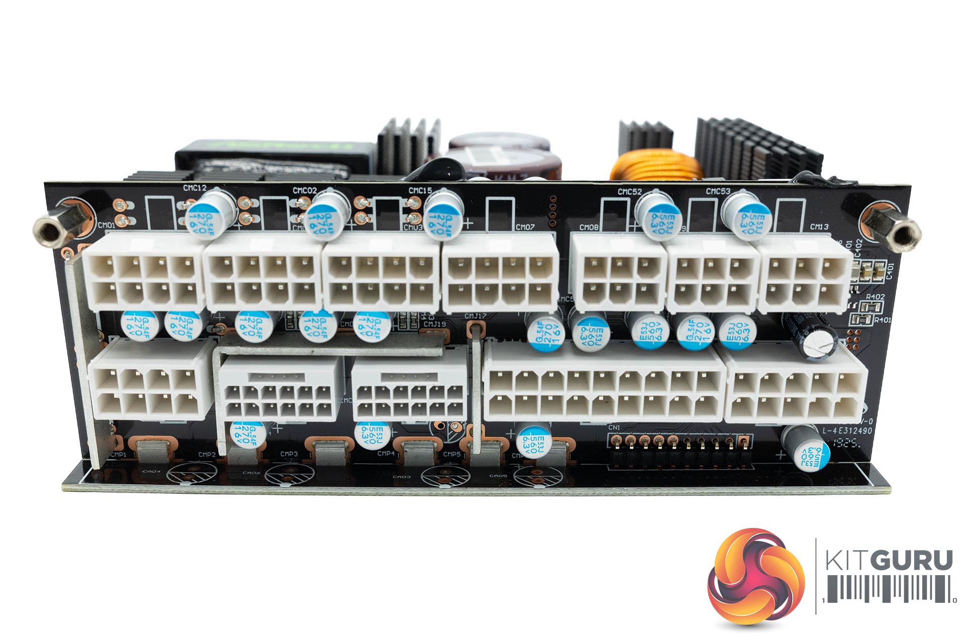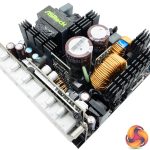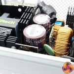 The primary capacitors of choice are Nippon Chemi Con – a 450V 560uF cap along with a 450V 460uF cap, for a total of 1020uF. Both caps are from their KHE and KMZ series and are both rated at 105C. On the secondary side of the unit there are six MOSFETs which generate the primary 12V rail. The 3.3V and 5V lines are generated from DC to DC converters mounted on a vertical daughtercard connected to the main PCB to save space. Caps in the secondary stage are from Nippon Chemi Con and Rubycon – both excellent Japanese manufacturers.