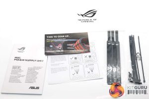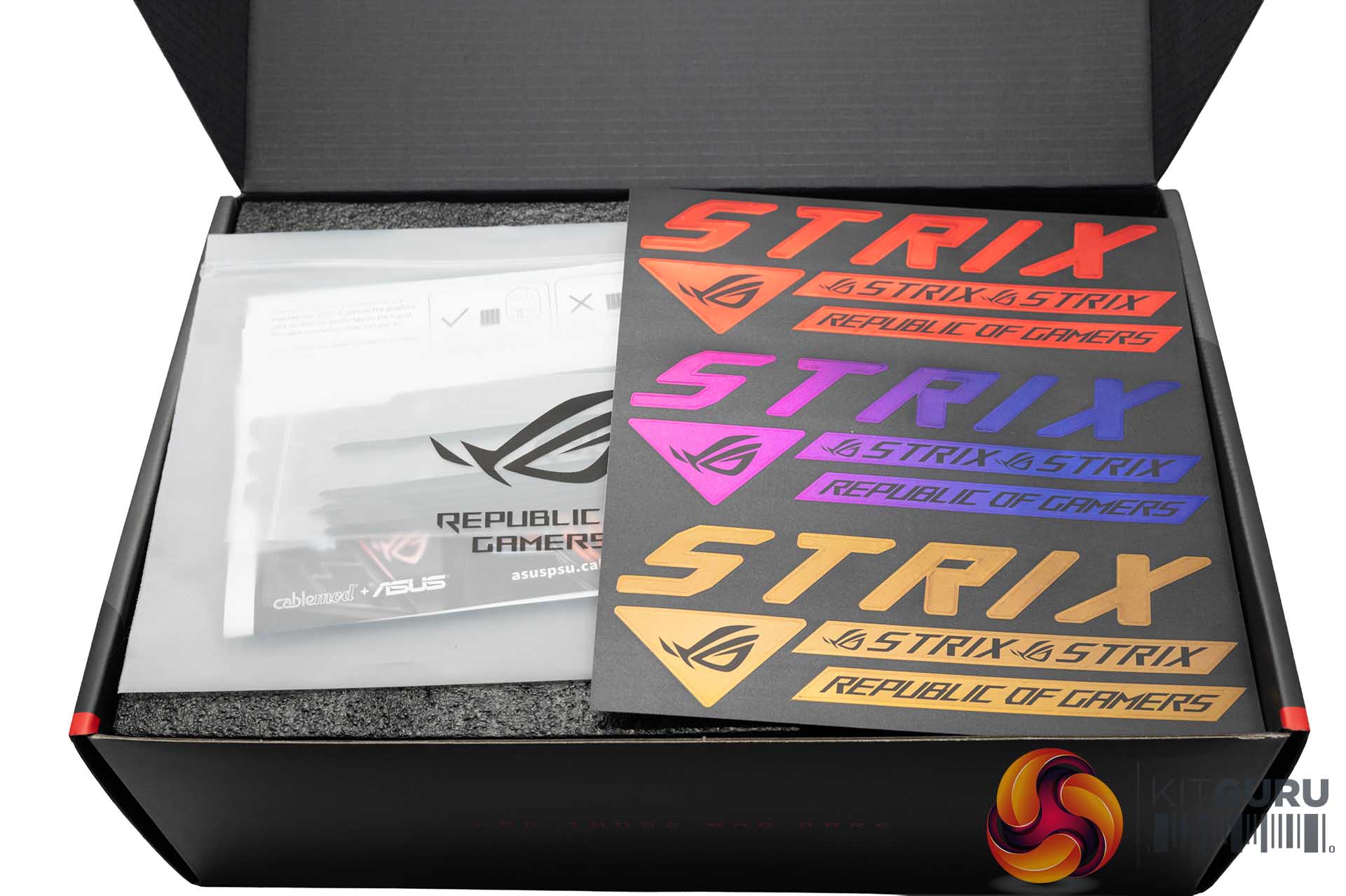 The power supply ships well sandwiched between pieces of foam. Packaging is good. Inside the box, we see some ‘stickers' that ASUS include to let the end user customise the looks of the power supply.