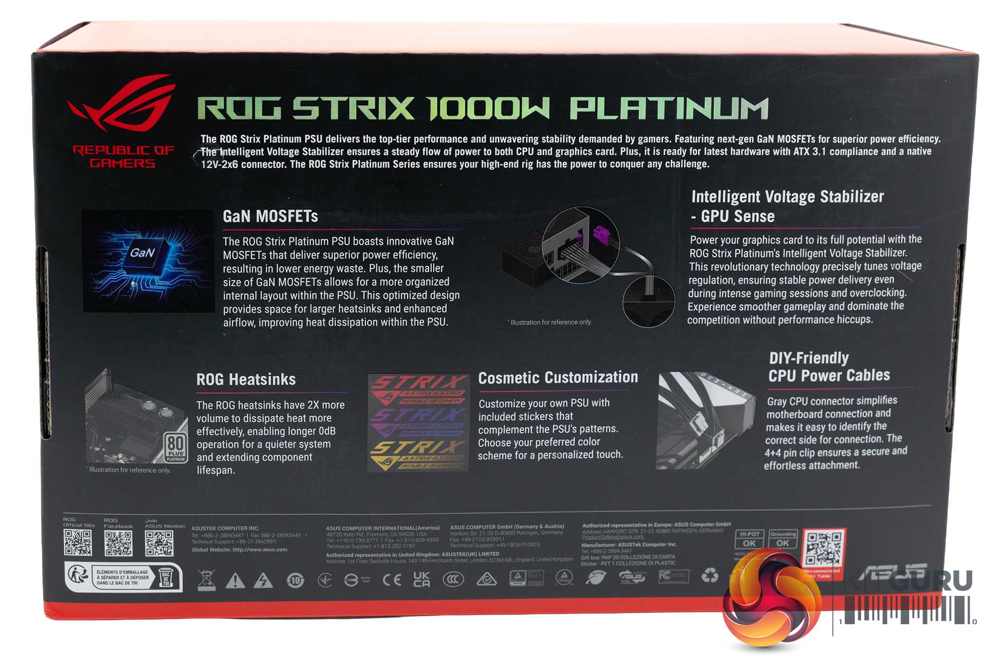 The rear of the box is loaded with information, including the GaN MOSFETs, Intelligent Voltage Stabiliser – GPU Sense and other things such as ‘DIY Friendly' cables, and the ROG Heatsinks.