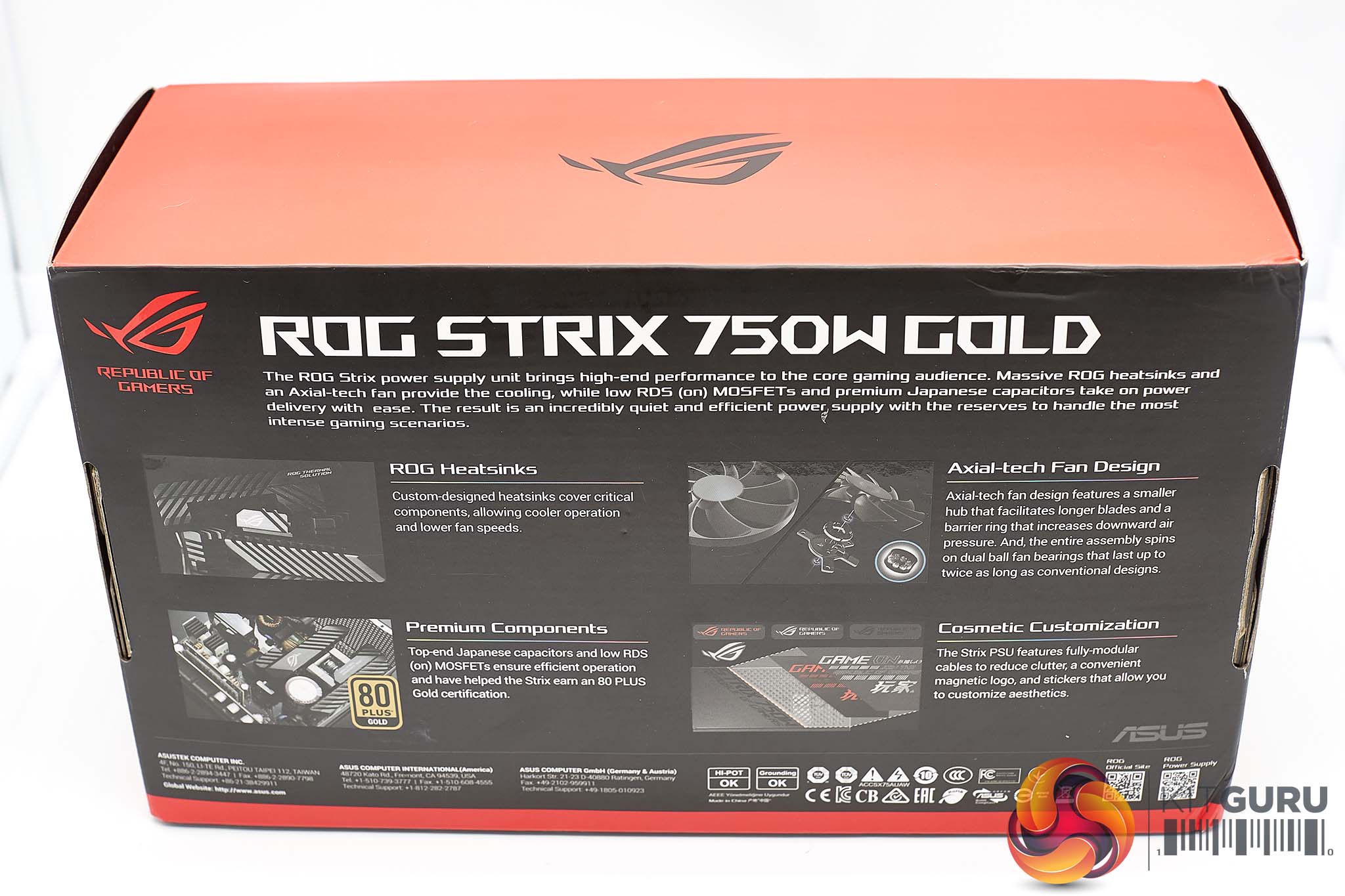 The box for the ASUS ROG Strix 750W power supply is quite effective and rather attractive. We like the RGB/Rainbow style logo bottom left and the high resolution image of the power supply on the right side.