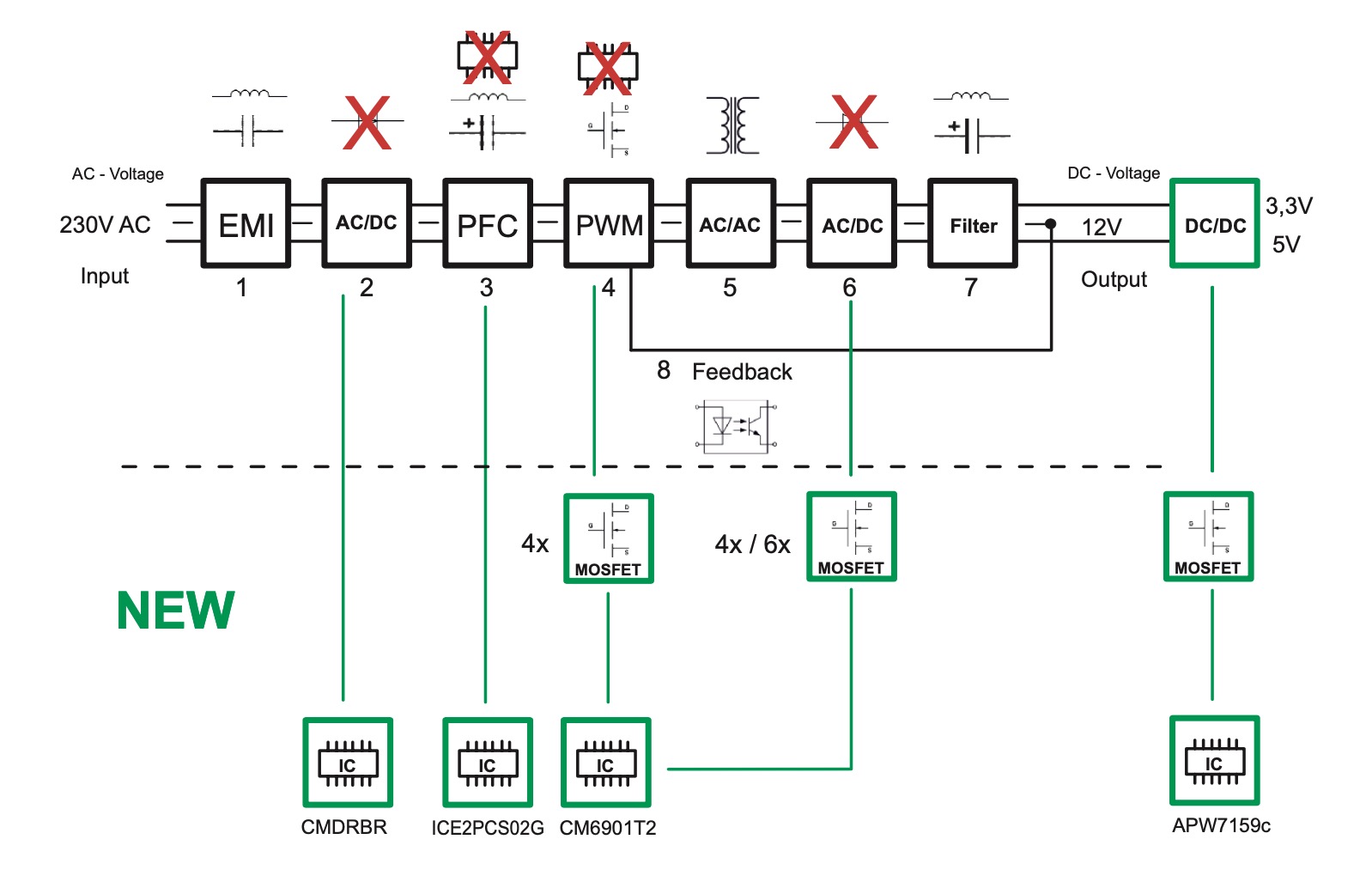 Instead of generating all necessary voltages (3.3V, 5V and 12V) from the AC on the primary side, the lower 3.3V and 5V voltages are generated from the 12V DC after the main transformation.