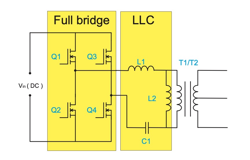 The circuit following the Full Bridge topology is LLC. L is the switching symbol for a coil, the C for a capacitor. The LLC series resonant circuit consists of two induction coils (L1+L2) and one capacitor (C1).