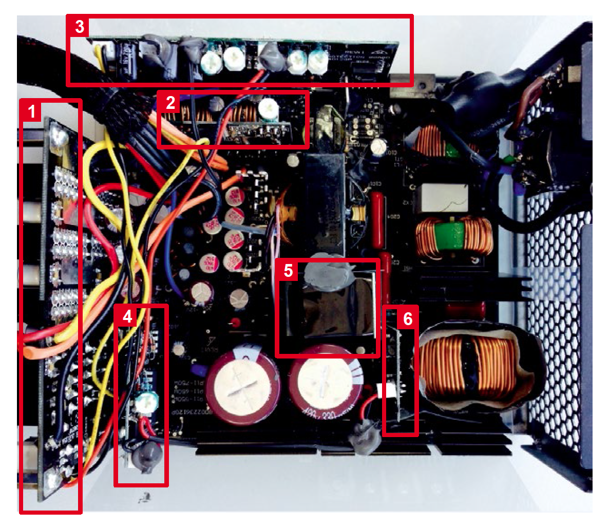 The 550W, 650W and 750W Dark Power Pro 11 power supplies are complimented with 6 daughter cards, highlighted above. be quiet! claim that by using these daughter boards the interior layout is improved, helping enhance air flow. This higher build density means shorter circuit paths.