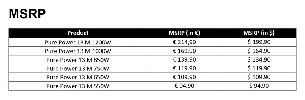• Pure Power 13 M is a semi-passive PSU, only cooled actively when necessary, for a quieter operation.